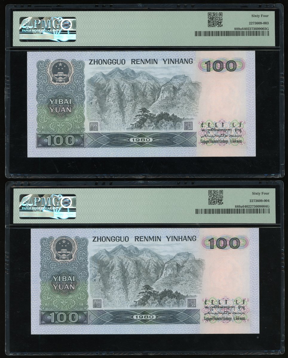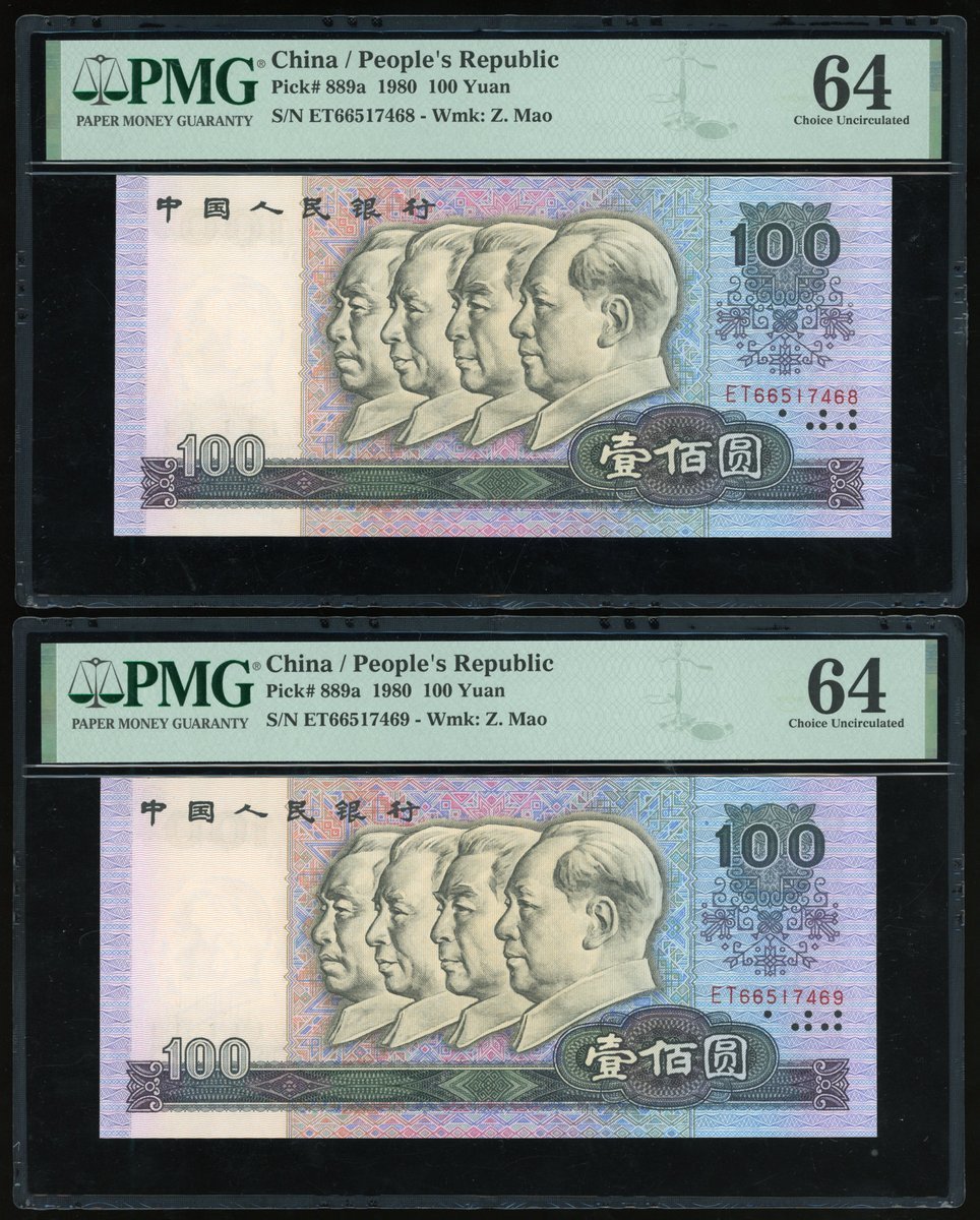 People's Bank of China, 4th Series Renminbi, 1980, consecutive pair of 100 yuan, serial number ET66517468-9, (Pick 889a), both PMG graded 64, choice uncirculated.(2)