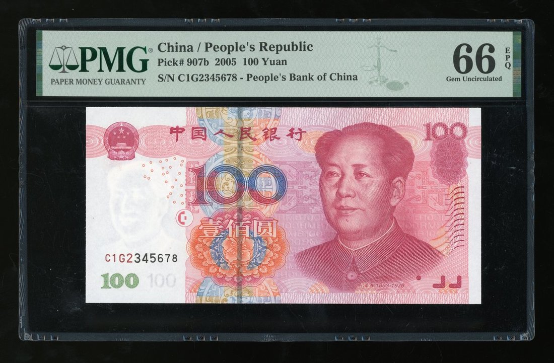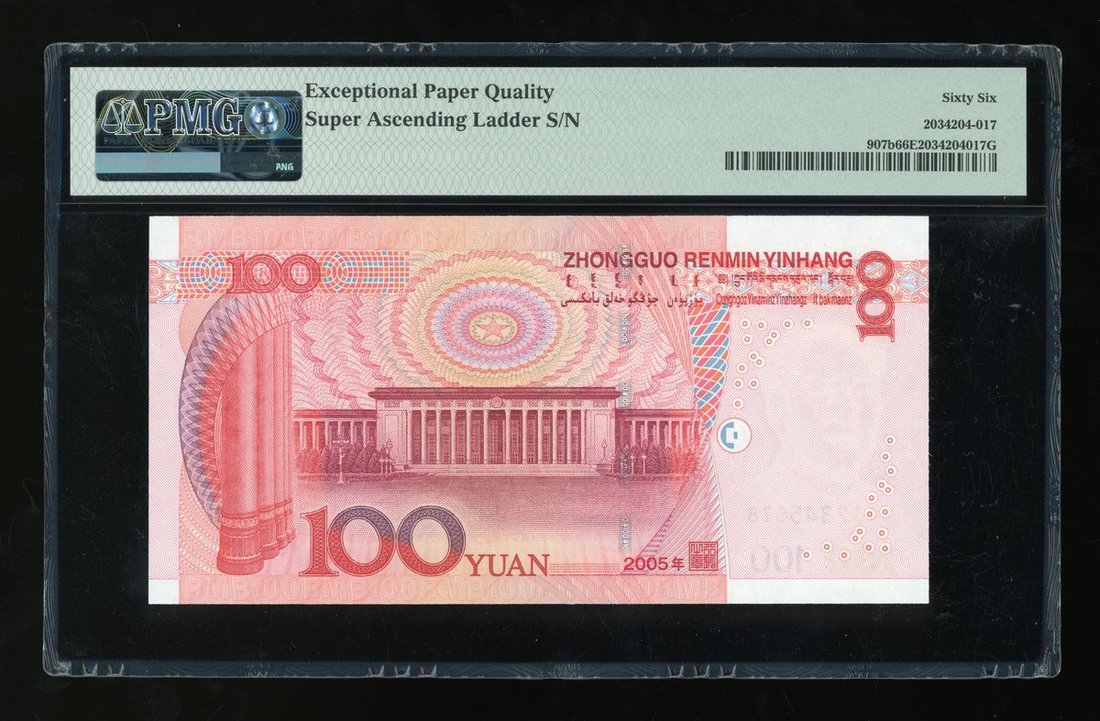 2005年中國人民銀行第五版人民幣一組10枚壹佰圓,連號 C1G2345671-680,包括超級順蛇號C1G2345678,順蛇號 PMG 66EPQ,餘下UNC品相