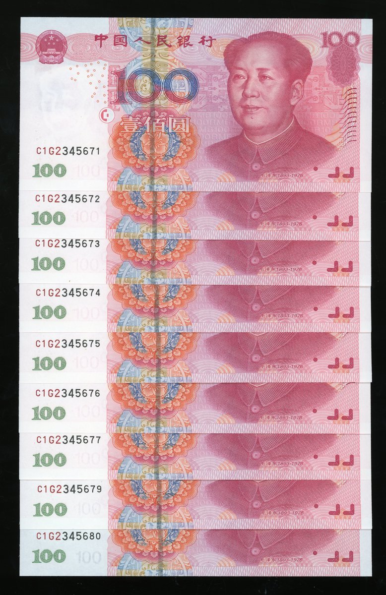 People's Bank of China, 5th Series Renminbi, 2005, consecutive 100 yuan, including super acending ladder serial number C1G2345678, serial numbers C1G2345671-680,