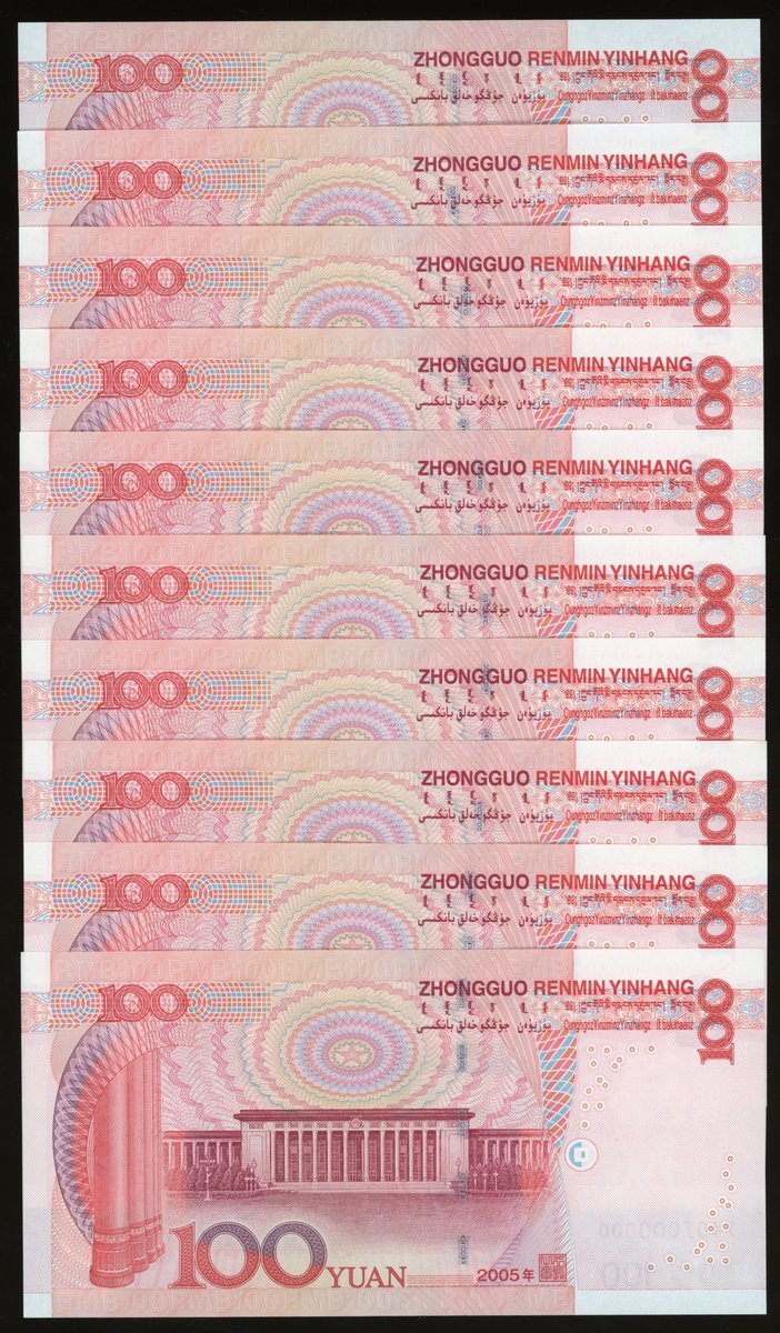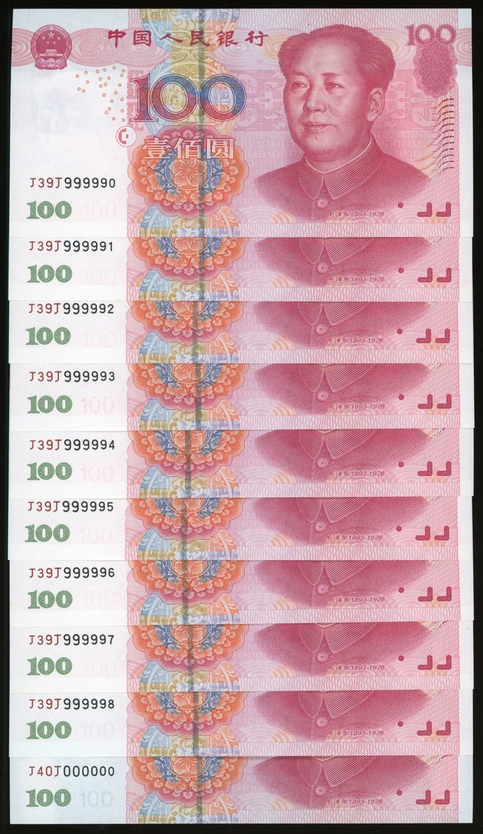 People's Bank of China, 5th Series Renminbi, a near consecutive group of 10x 100 yuan, 2005, serial numbers J39J 999990-98, and J40J 000000,