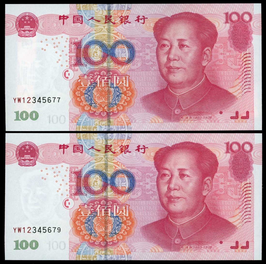 People's Bank of China, 5th Series Renminbi, a pair of 100 yuan, 2005, serial numbers YW12 345677, and YW12 345679,