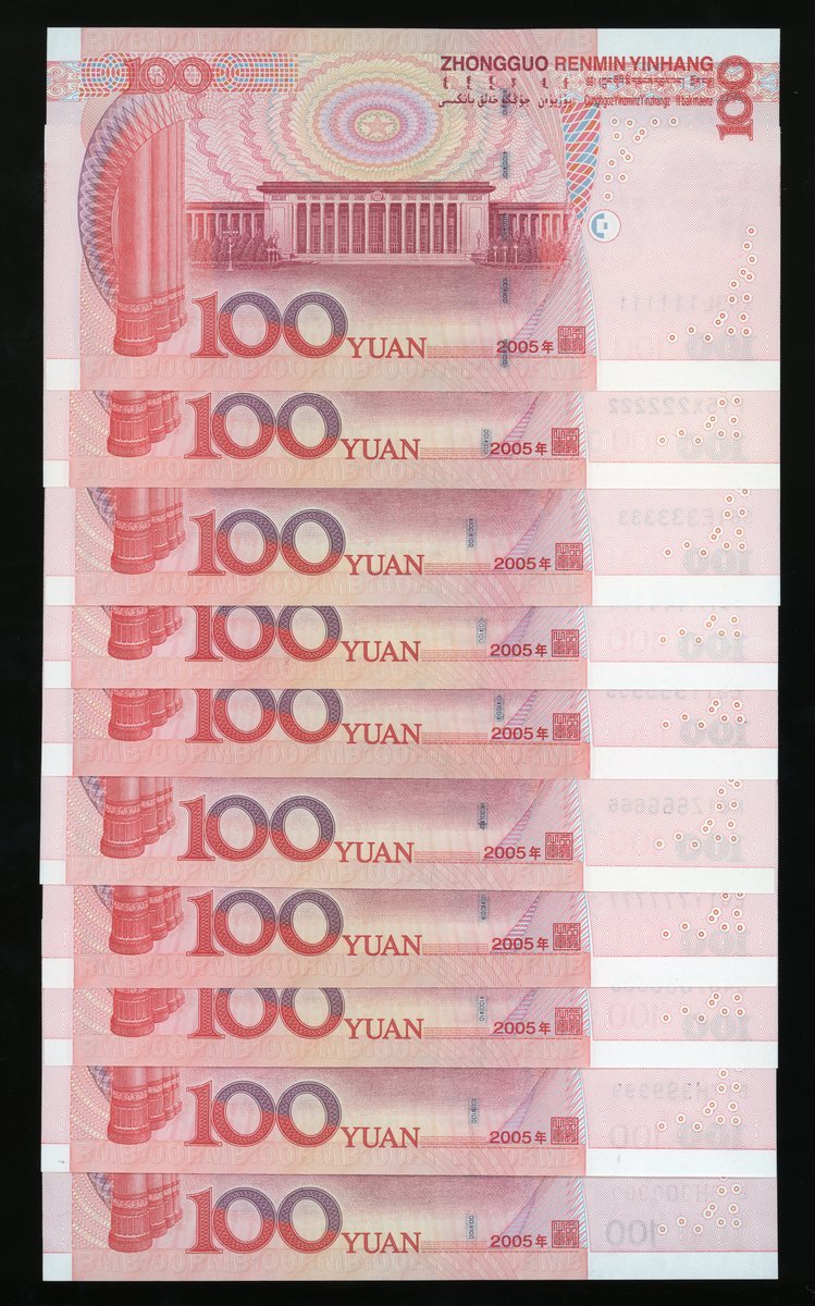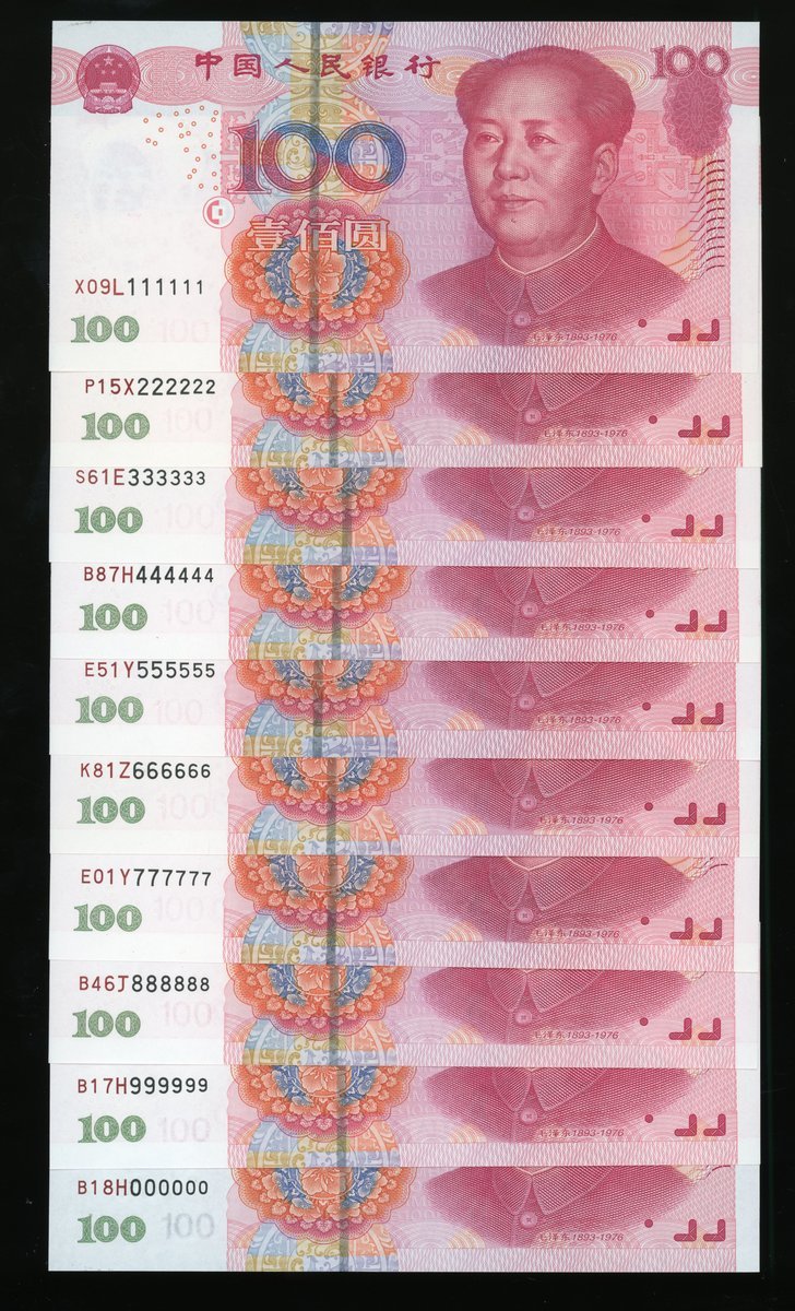 2005年中國人民銀行第五版人民幣一組10枚壹佰圓,包括幸運號 X09L 111111, P15X 222222, S61E 333333, B87H 444444, E51Y 555555, K81Z 666666, E01Y 777777, B46J 888888, B17H 999999, B18H 000000,UNC品相