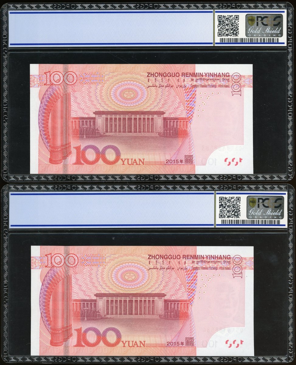 People's Bank of China, 5th Series Renminbi, 2015, consecutive pair 100 yuan, fancy serial number Q5F8888883/34, (Pick 909), PCGS 68OPQ (2)
