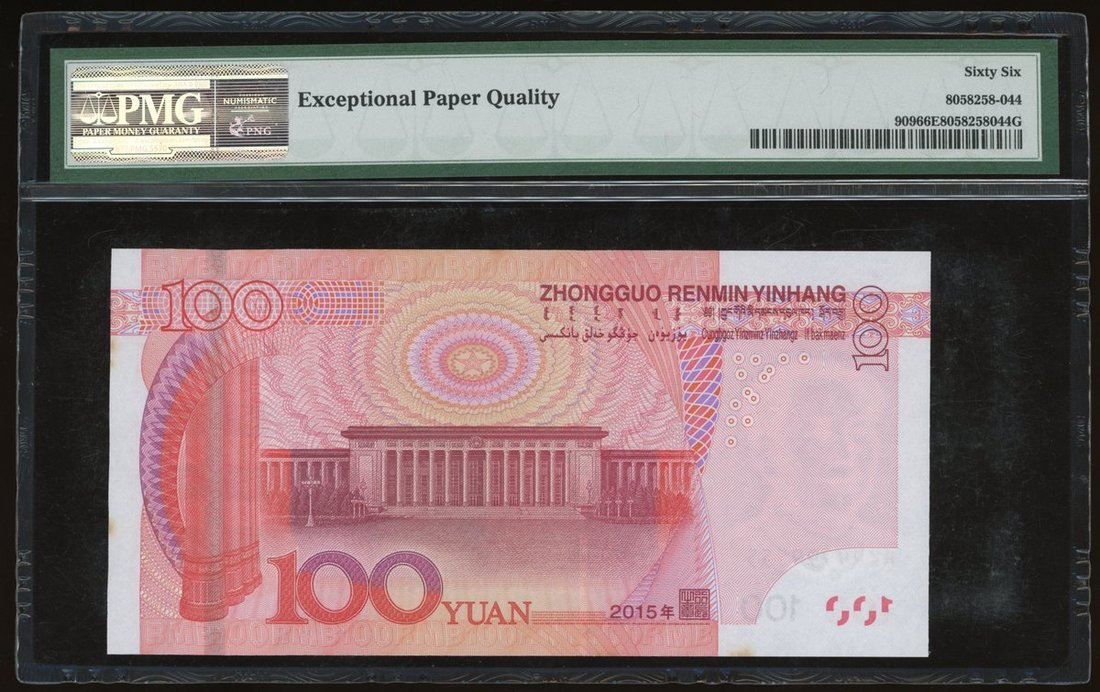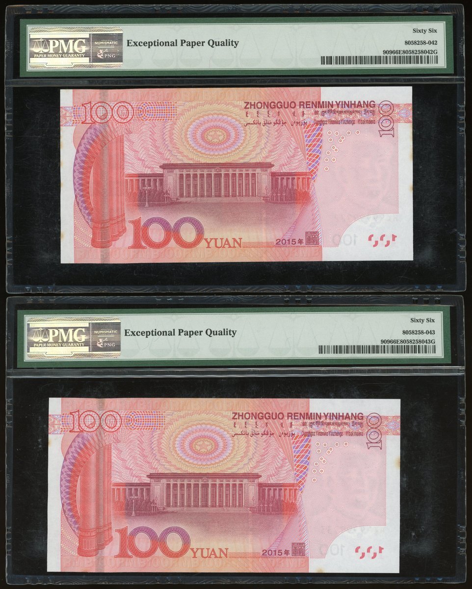 People's Bank of China, 5th Series Renminbi, a trio of 100 yuan, 2015, fancy serial numbers HK99 999922, HK99 999933 and HK99 999555,
