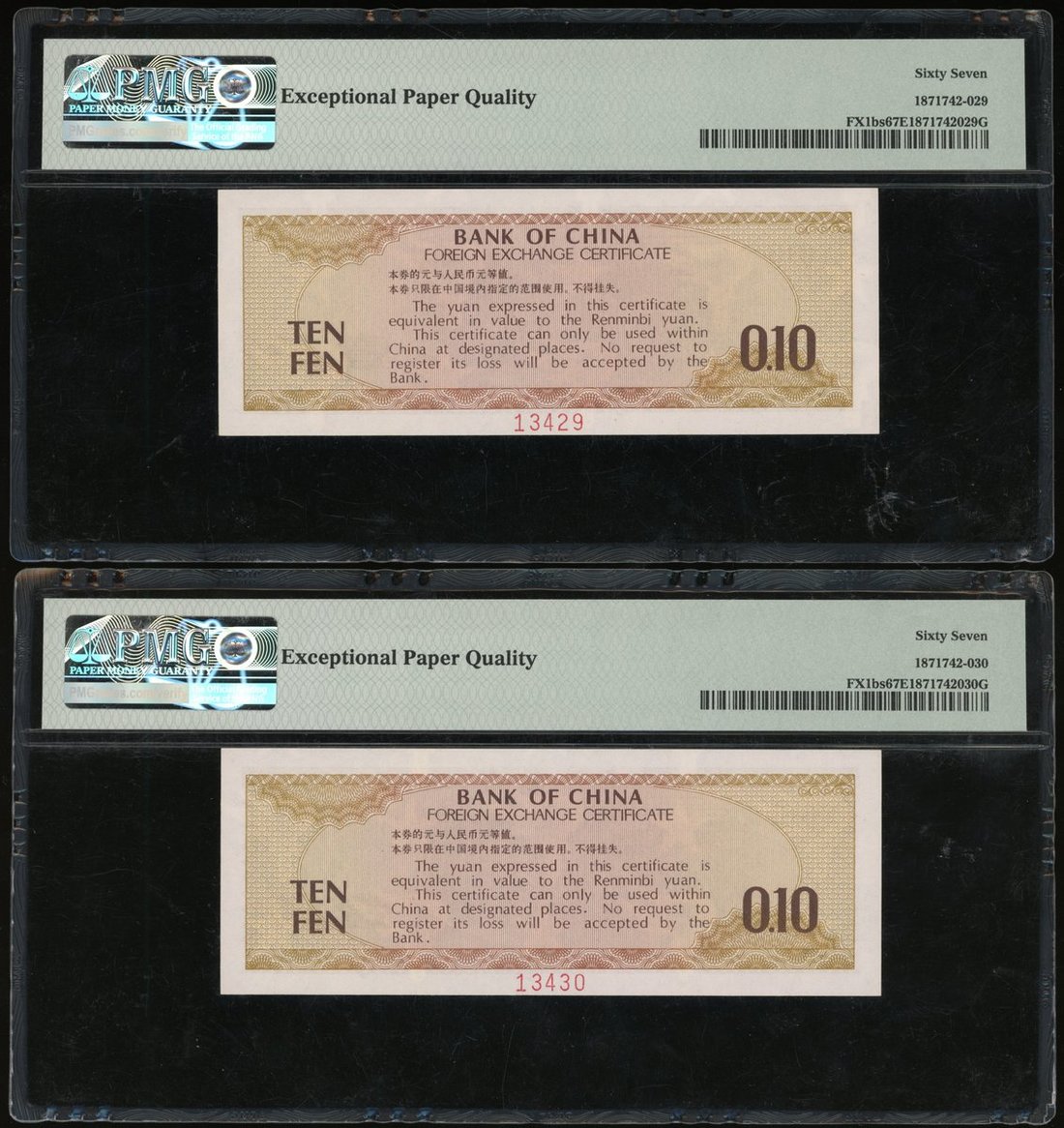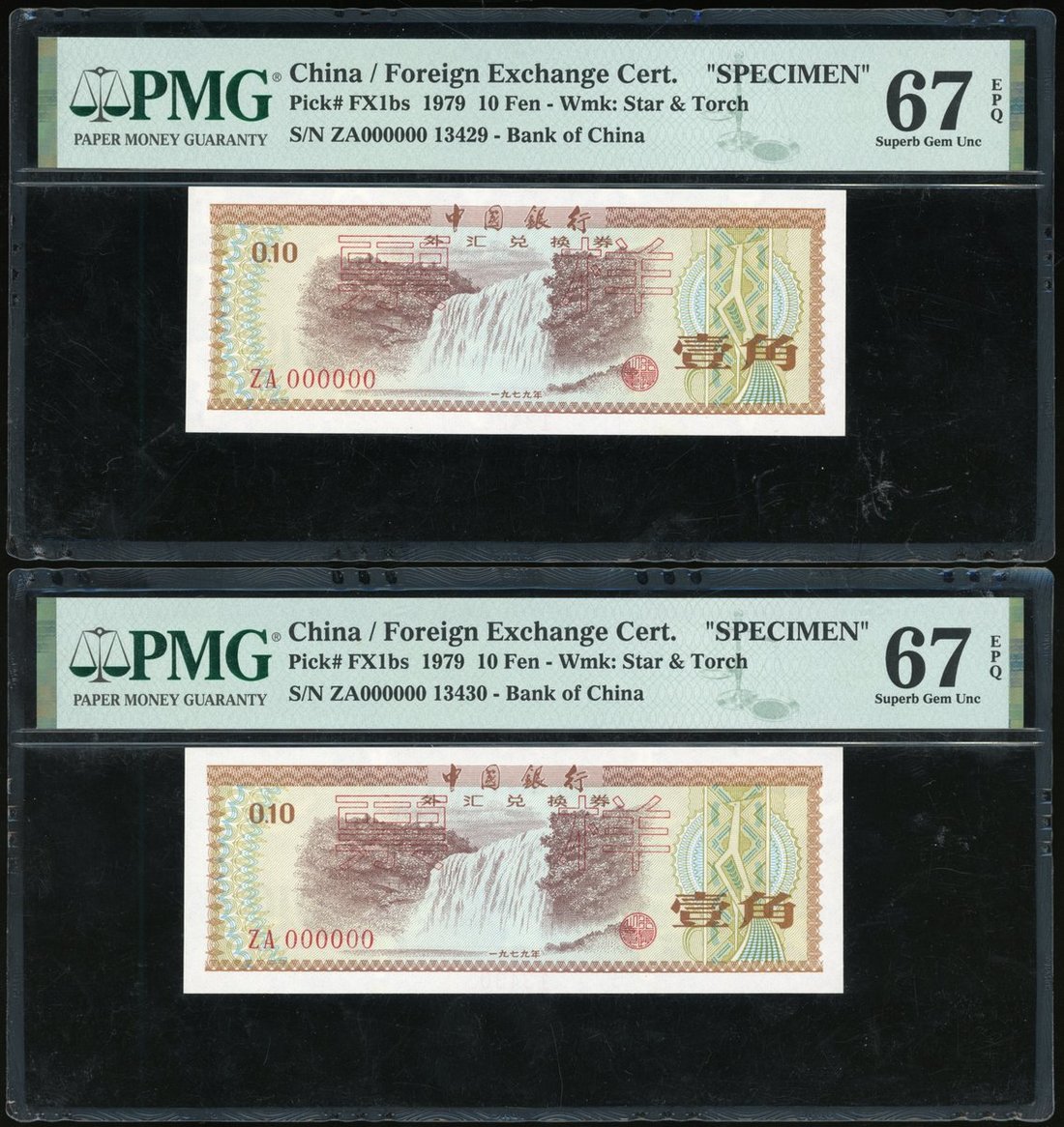 Foreign Exchange Certificate, Bank of China, specimen 10 fen (2), 1979, serial number ZA000000 13429/13430, (Pick FX1bs), both PMG 67EPQ (2)