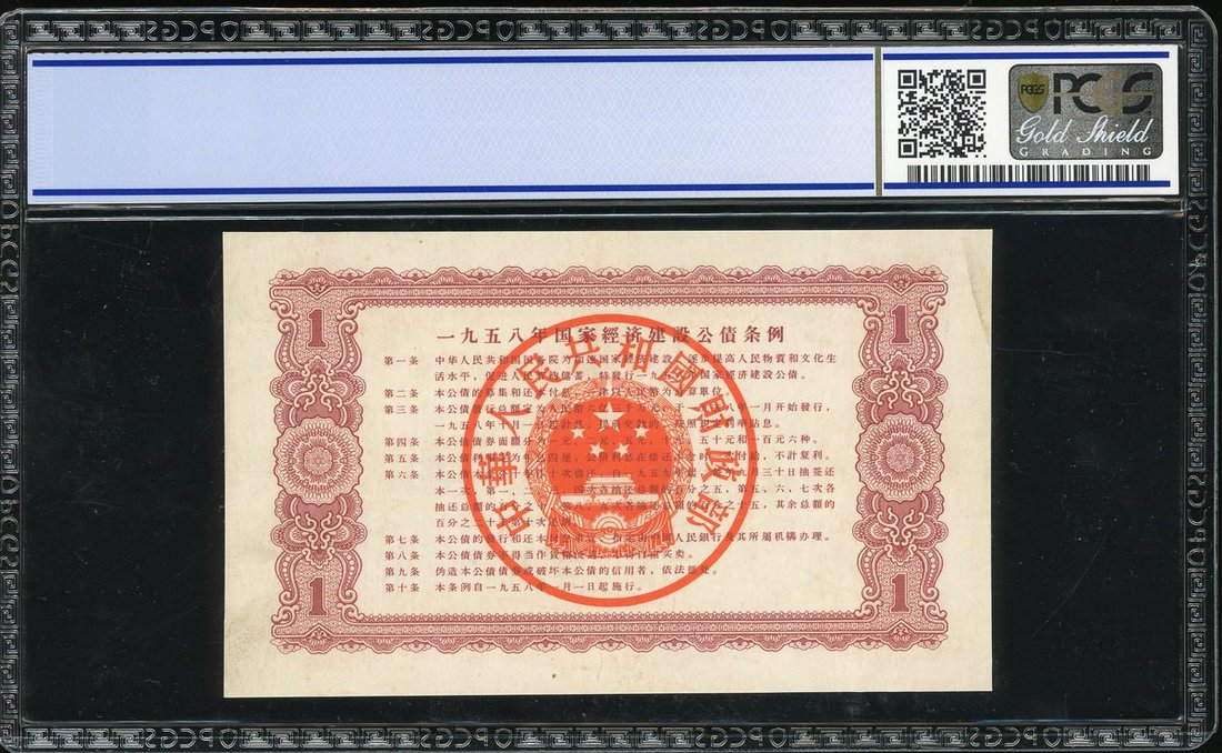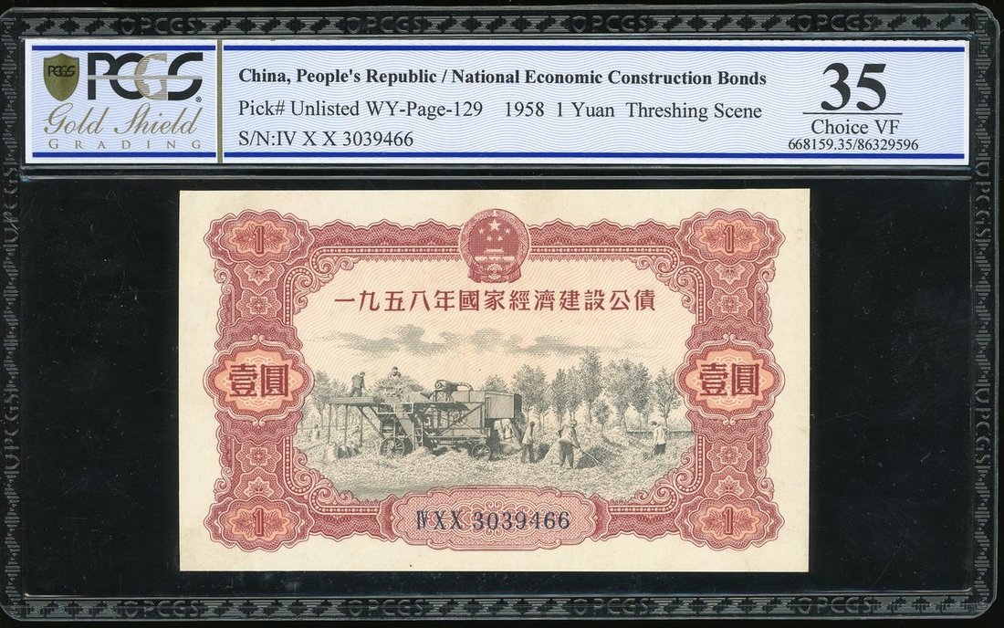 People's Republic of China, 1 Yuan National Economic Construction Bond, 1958, serial number IV X X3039466, (Pick unlisted), PCGS Gold Shield 35 Choice Very Fine