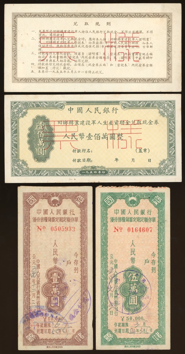 -Demobilised Soldiers Cash Coupon, 1954, obverse and reverse specimen 1 million yuan,