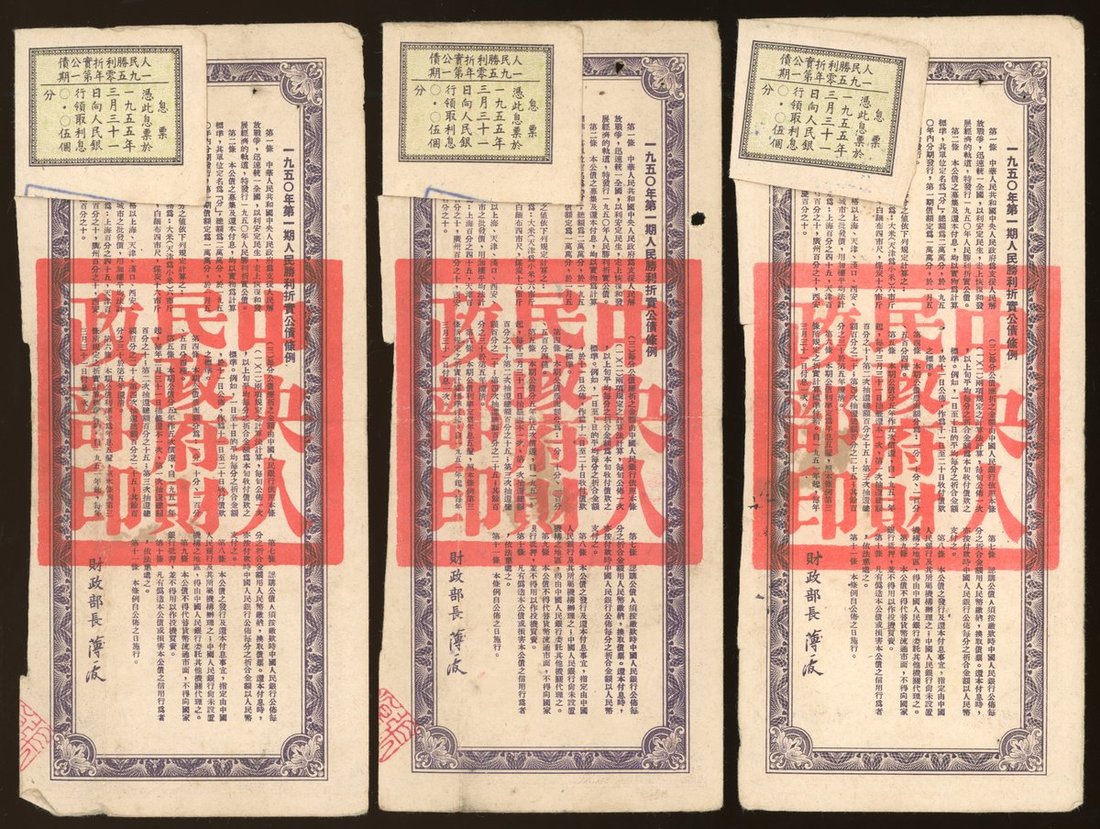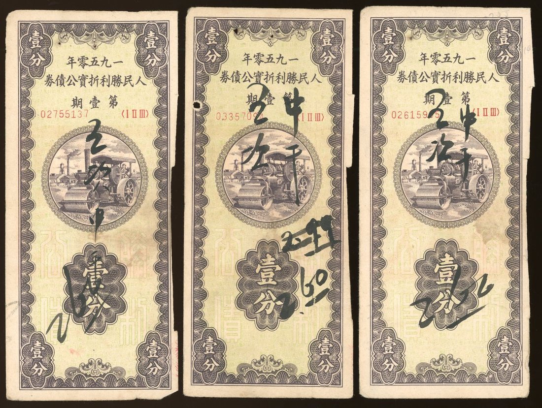 -People's Revolution Government Bond - First Series, 1950, 1 fen (3), all partially redeemed with 1 ticket each remaining,