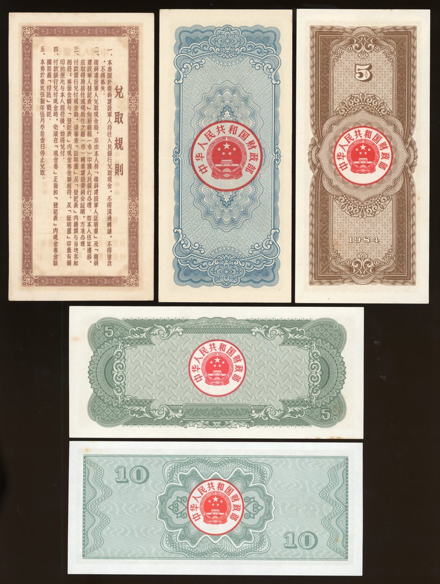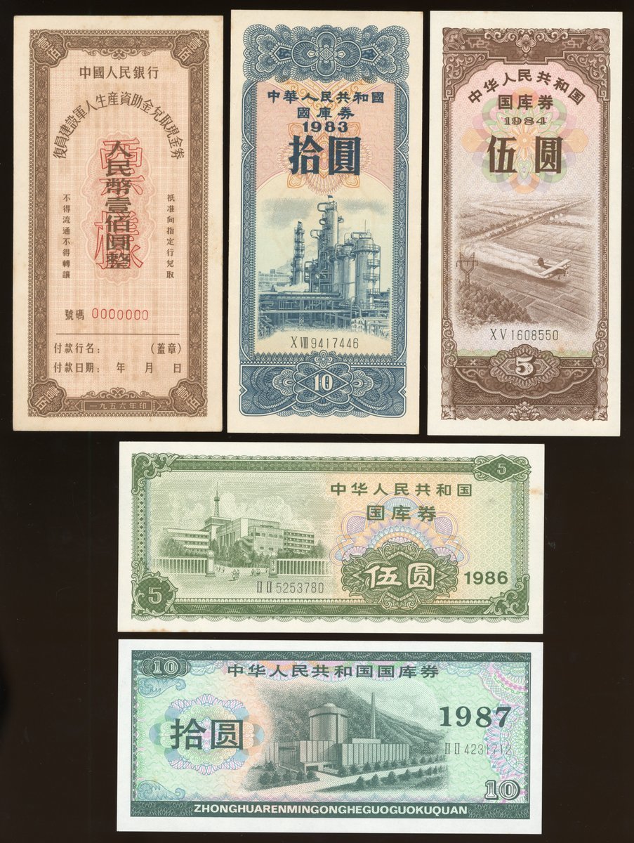 -State Treasury note, 1983 10 yuan, 1984 5 yuan, 1986 5 yuan, 1987 10 yuan,