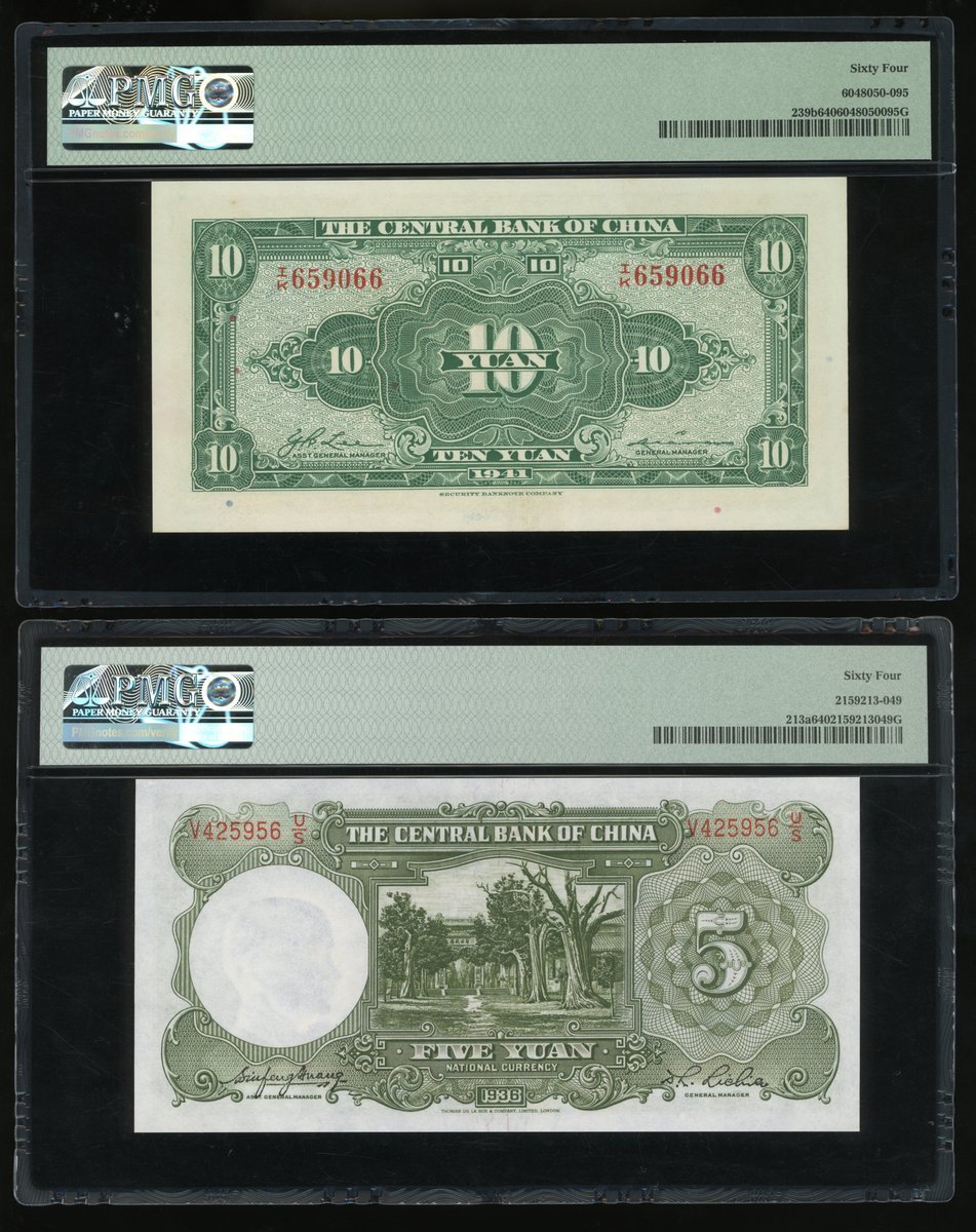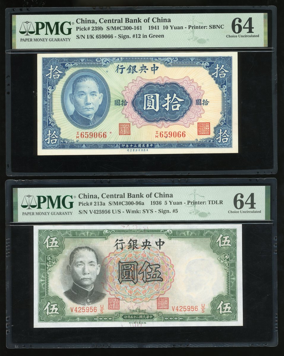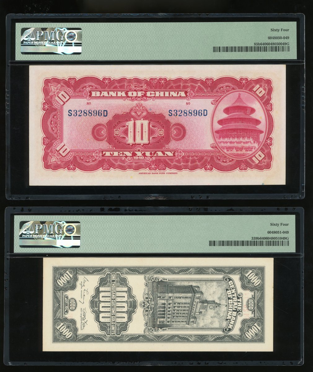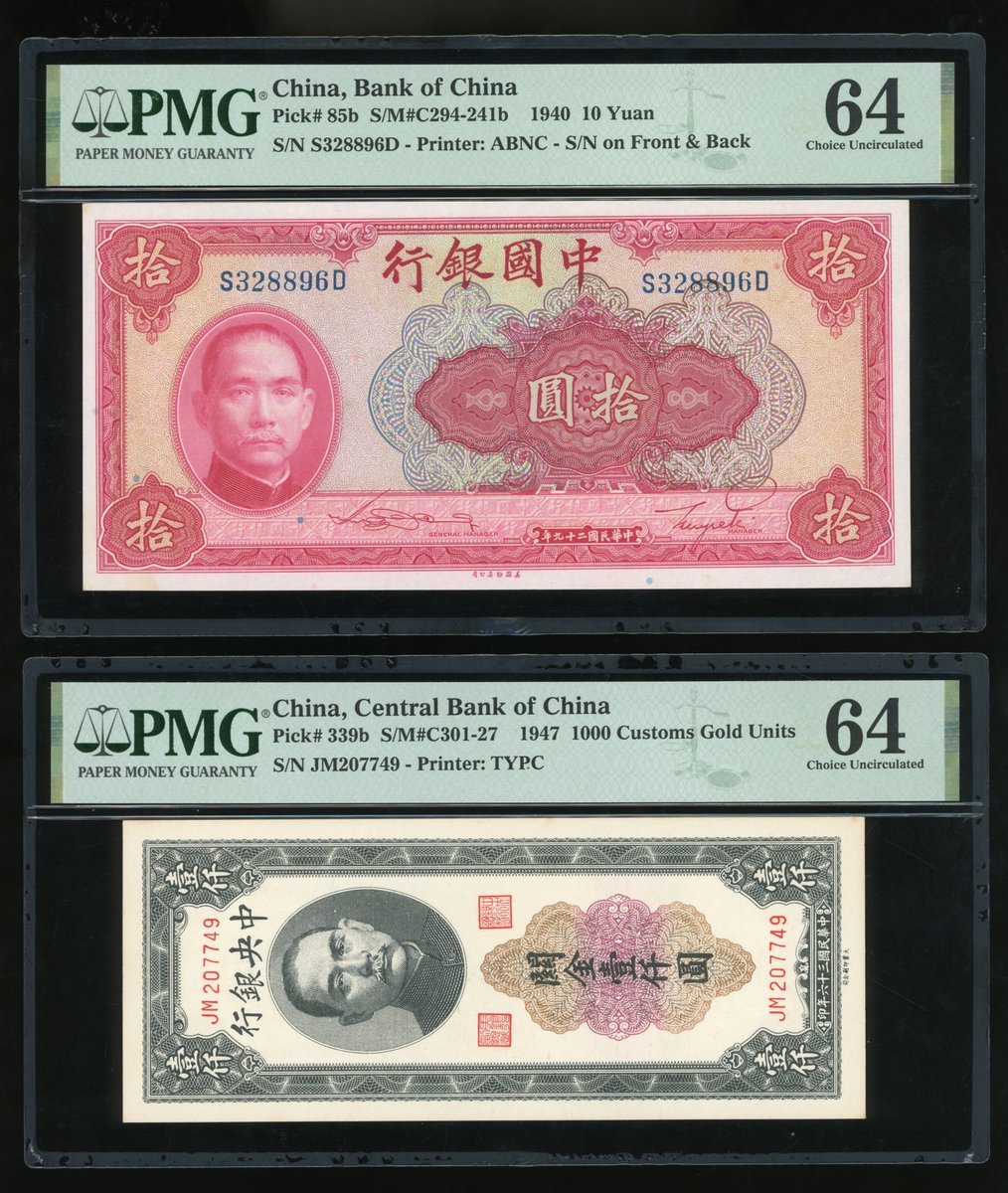 The Central Bank of China and Bank of China, a group of 4, including: Central Bank of China 1936 5 yuan, 1941 10 yuan, 1947 1000 Custom Gold Units and Bank of China 1940 10 yuan, serial numbers V 425956 U/S, I/K 659066, JM 207749 and S 328896 D,