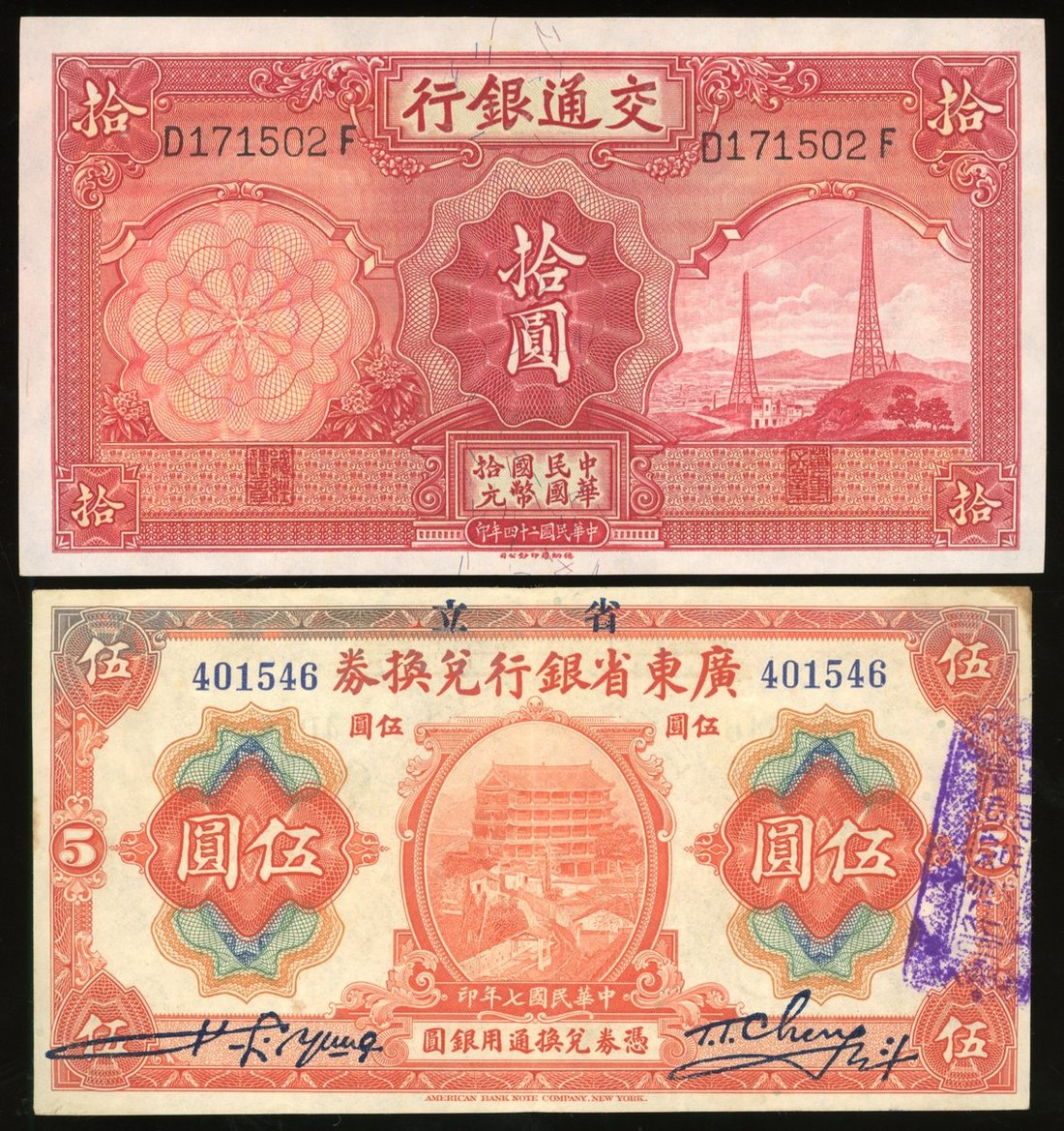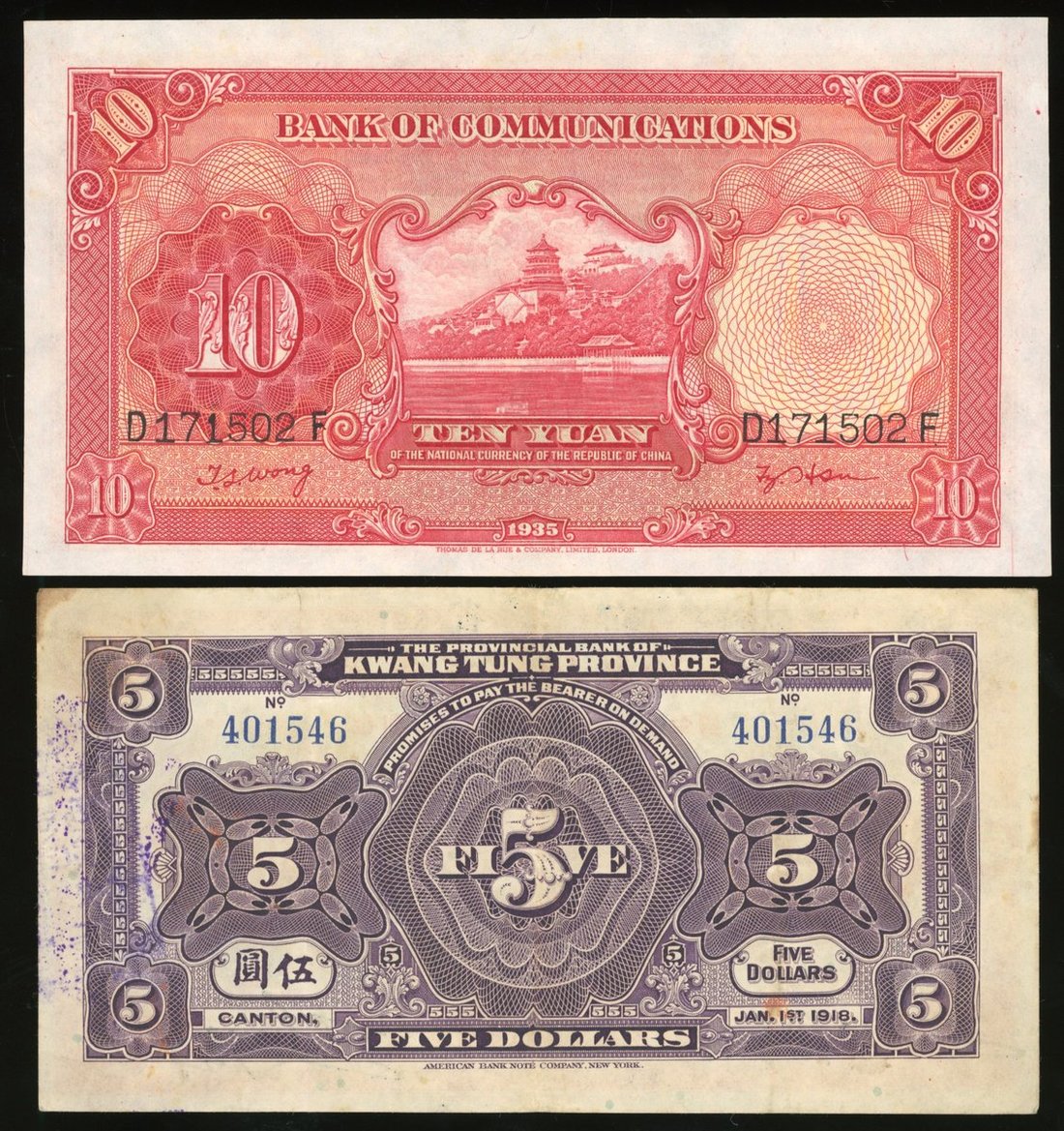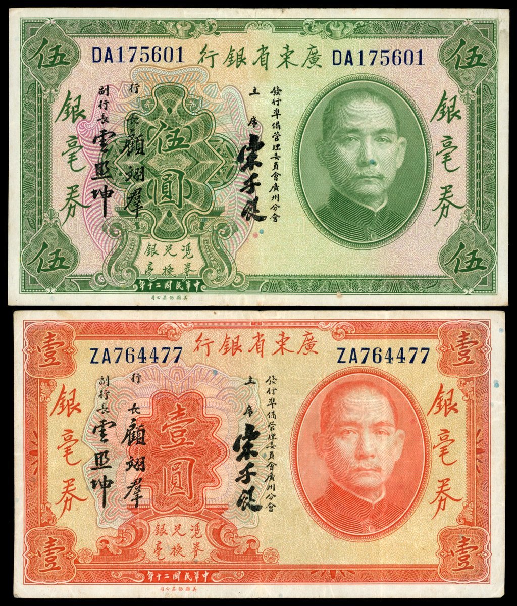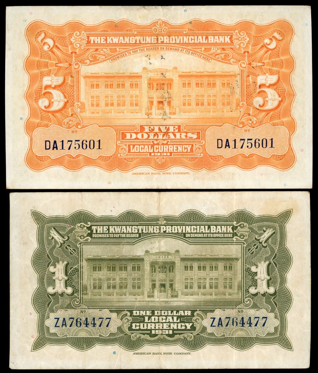 -Kwangtung Provincial Bank, 5 yuan Year 7, 1 and 5 yuan Year 20,