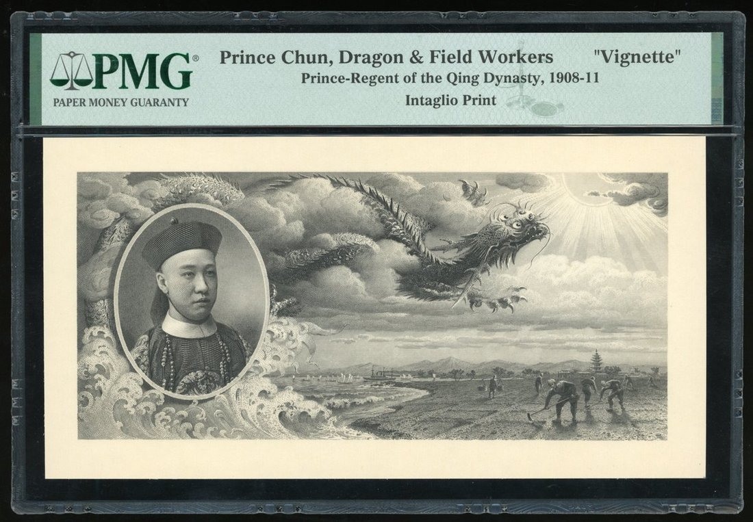 Intaglio Print, China, vignette of Prince Chun, dragon and field workers, black and white,
