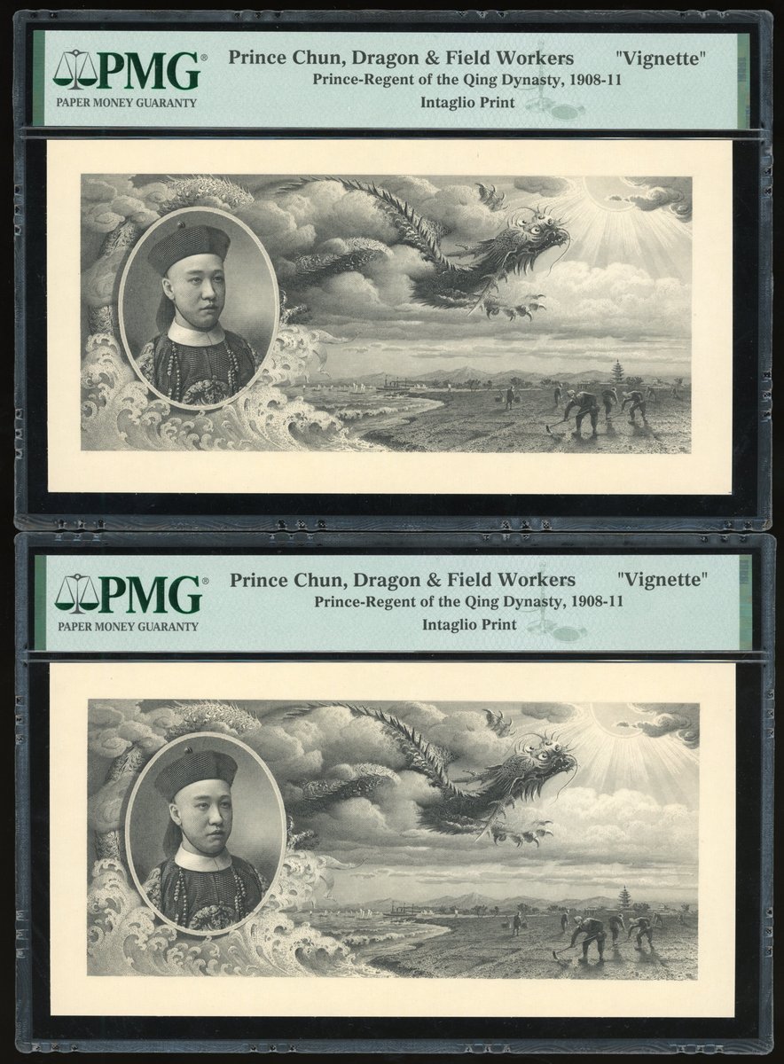 China, a pair of vignettes of Prince Chun of the Qing Dynasty, intaglio print, dragon and field workers, black and white,