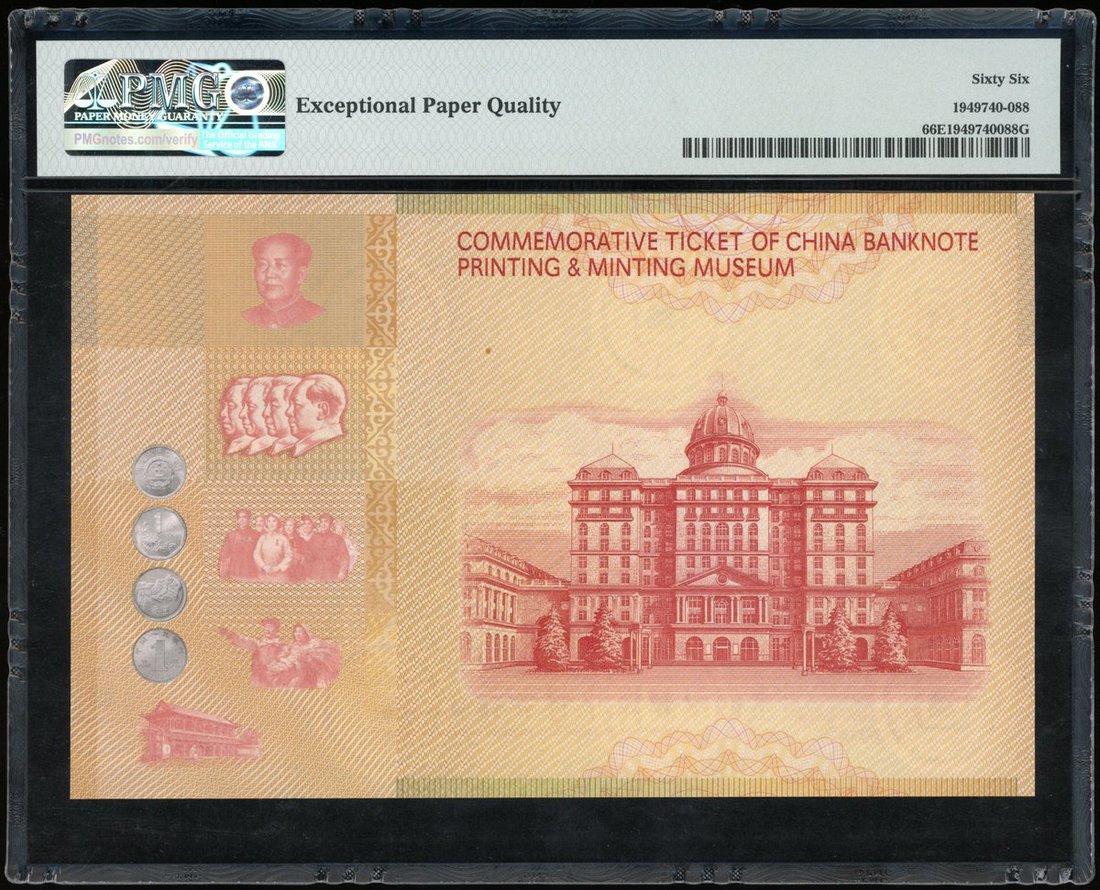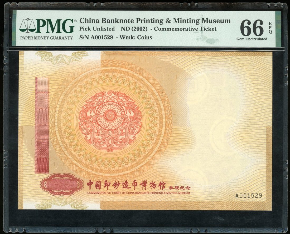 China Banknote Printing & Minting Museum, commemorative ticket, ND (2002), serial number A001529, PMG 66EPQ