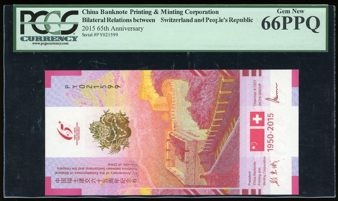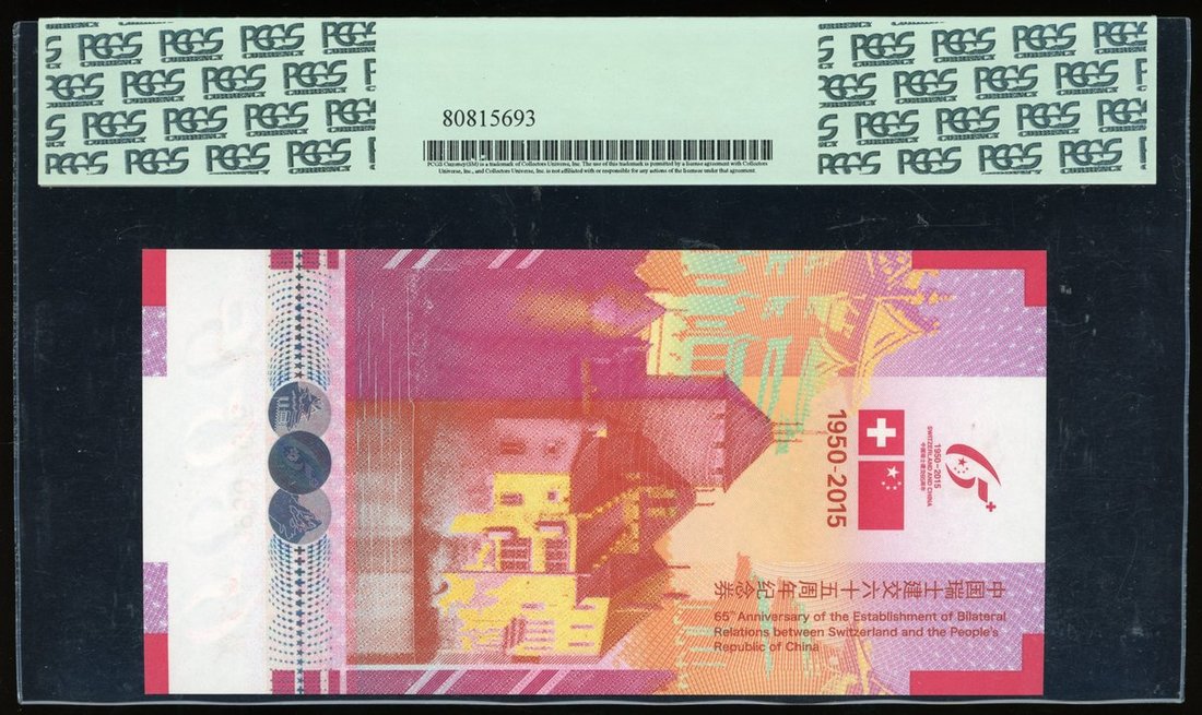 2015年中國瑞士建交六十五周年紀念券,編號 PY 021599,PCGS 66PPQ