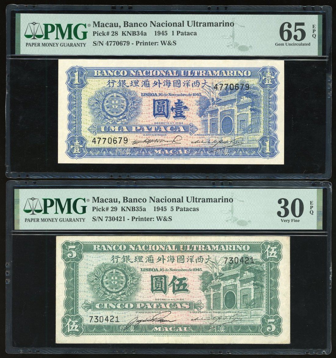 Banco Nacional Ultramarino, Macau, a pair, 1945, including 1 and 5 patacas, (Pick 28, 29), PMG 65EPQ and 30EPQ respectively (2)