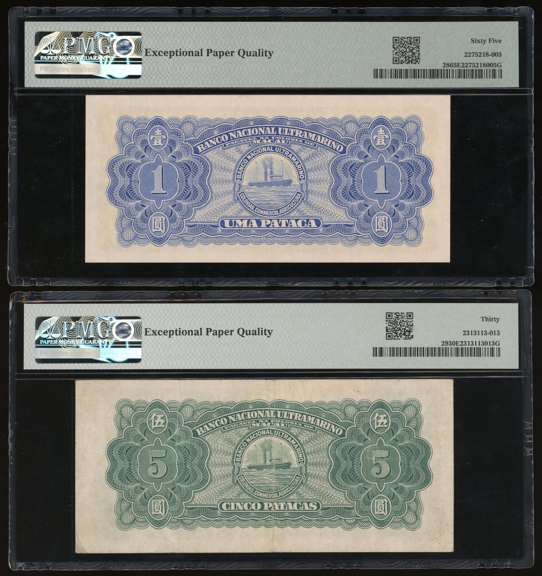1945年大西洋海外匯理銀行一組2枚,1元及5元,分別評級為PMG 65EPQ及PMG 30EPQ
