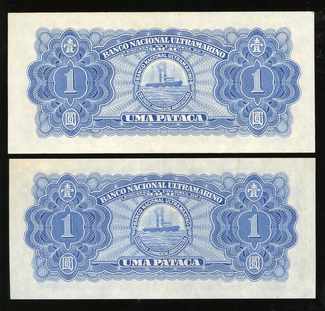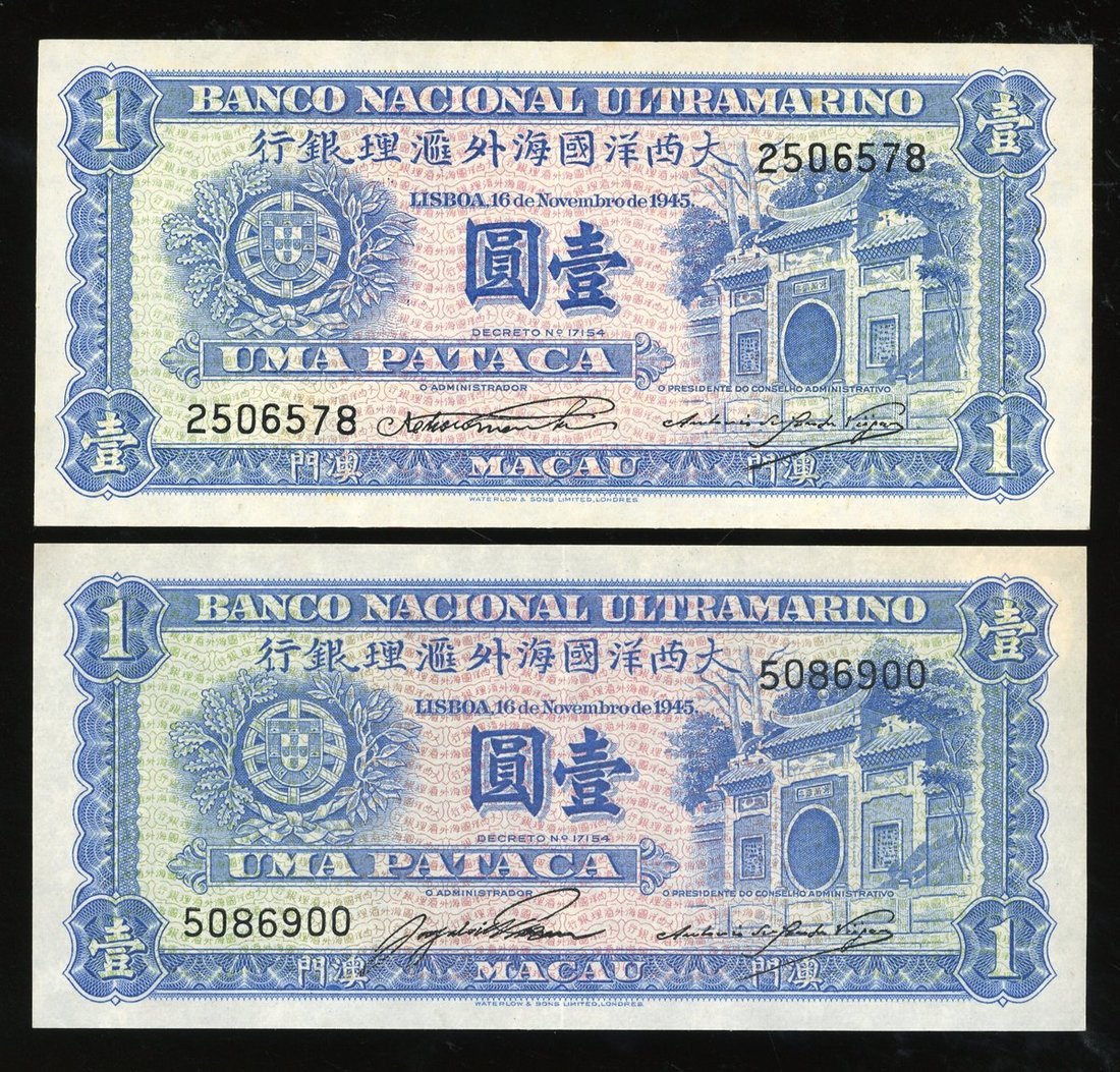 Banco Nacional Ultramarino, Macau, 1 pataca (2), 1945, administrator signatures, Pimenta and Coelho respectively,