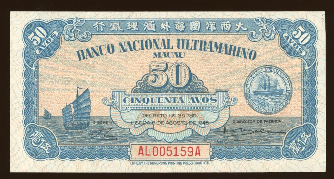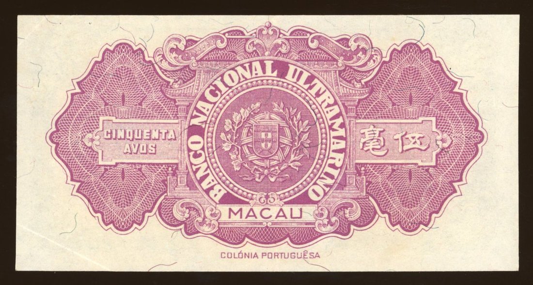 Banco Nacional Ultrarmarino, Macau, 50 avos, 1946, serial number AL005159A, (Pick 38a), centre crease, original extremely fine. First prefix