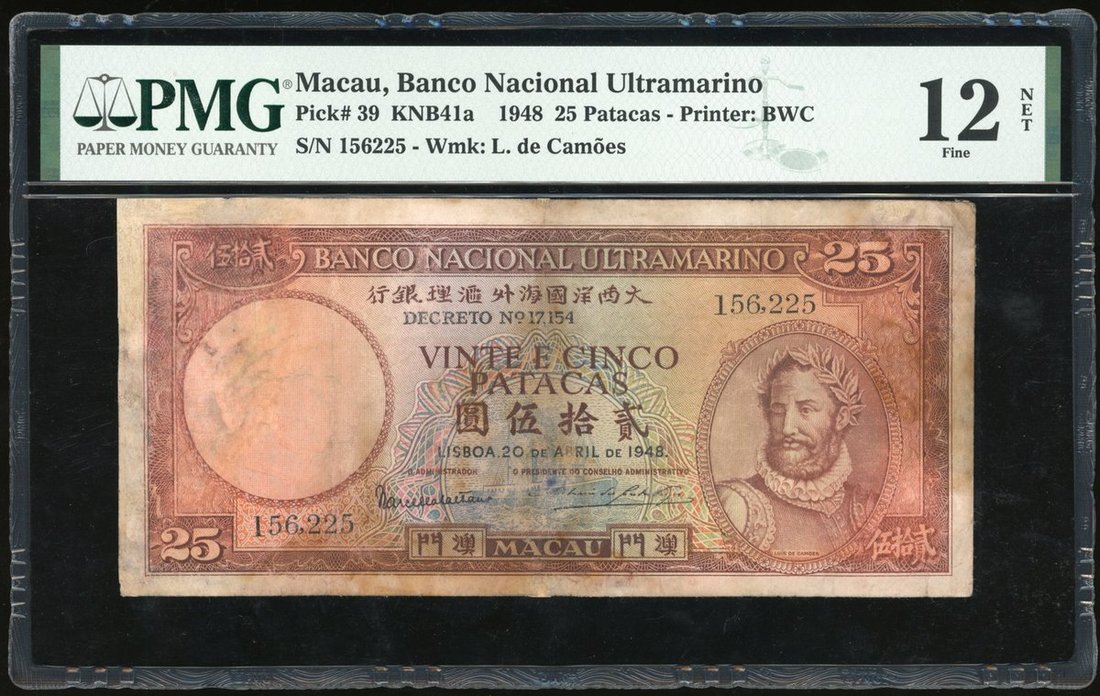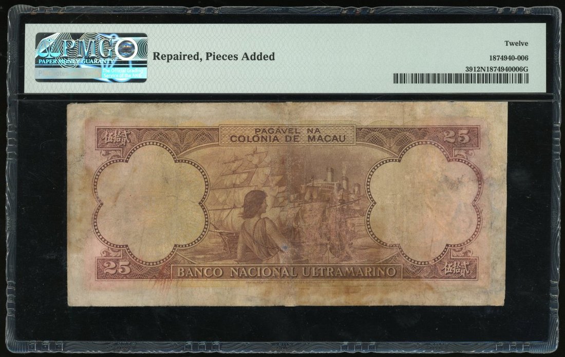 Banco Nacional Ultramarino, Macau, 25 patacas, 1948, serial number 156225, (Pick 39), PMG 12NET, repaired, pieces added. Rare type nonetheless