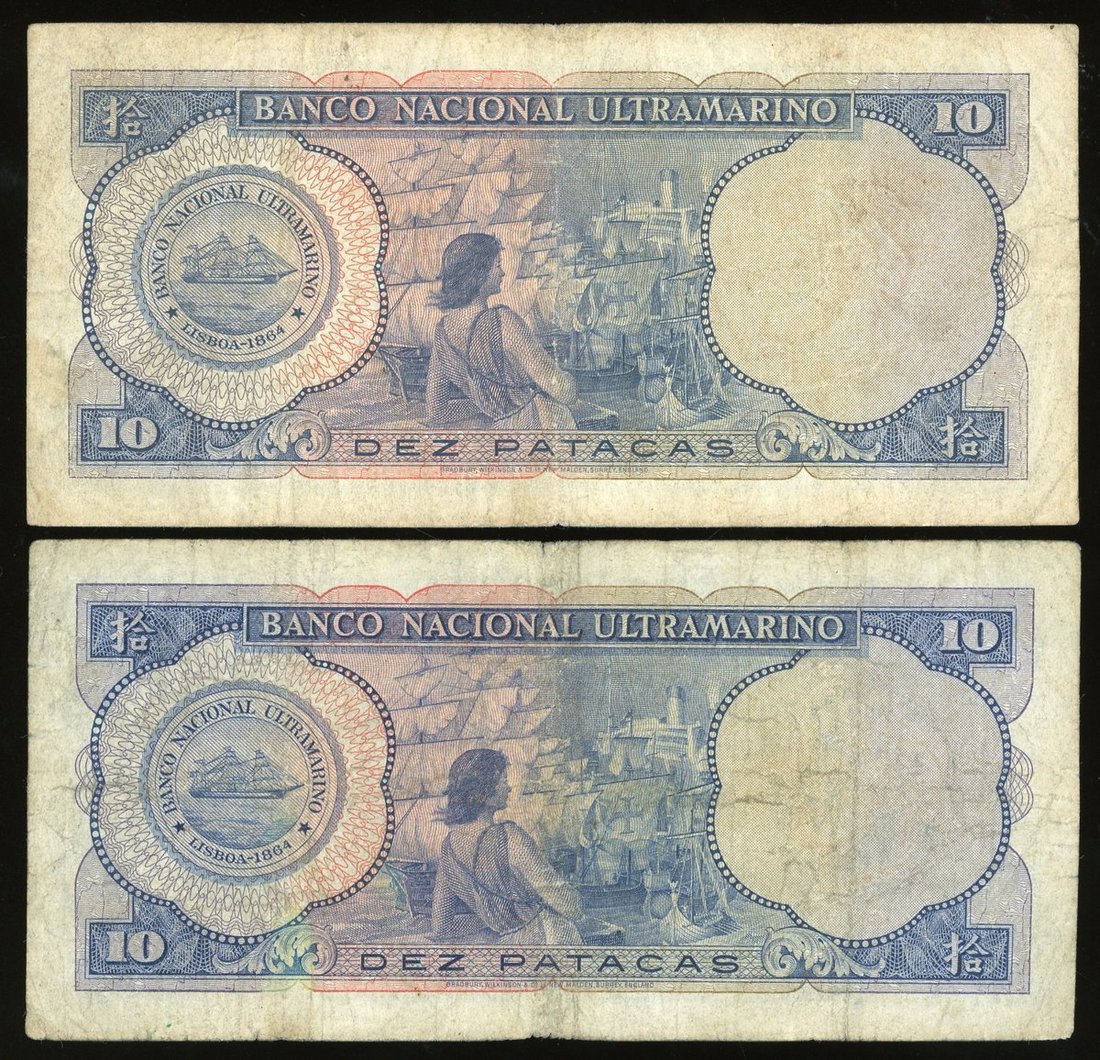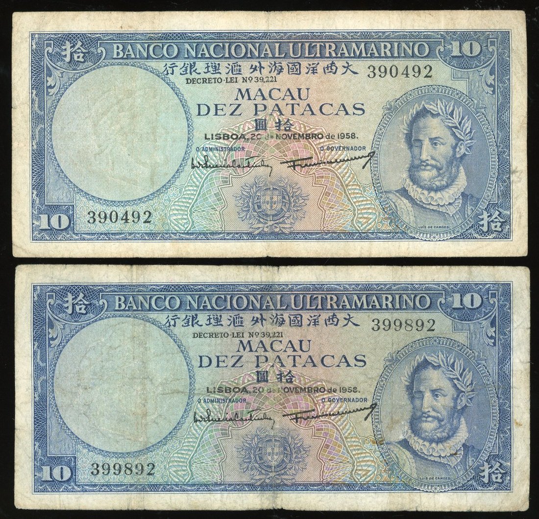 Banco Nacional Ultramarino, Macau, a pair of 10 patacas, 1958, serial numbers 399892 and 390492, (Pick 45), Very Fine (2)