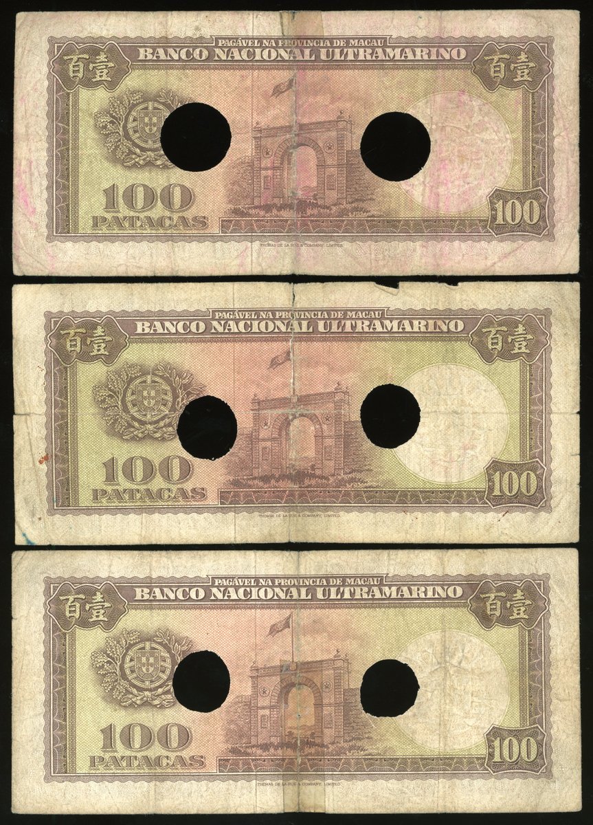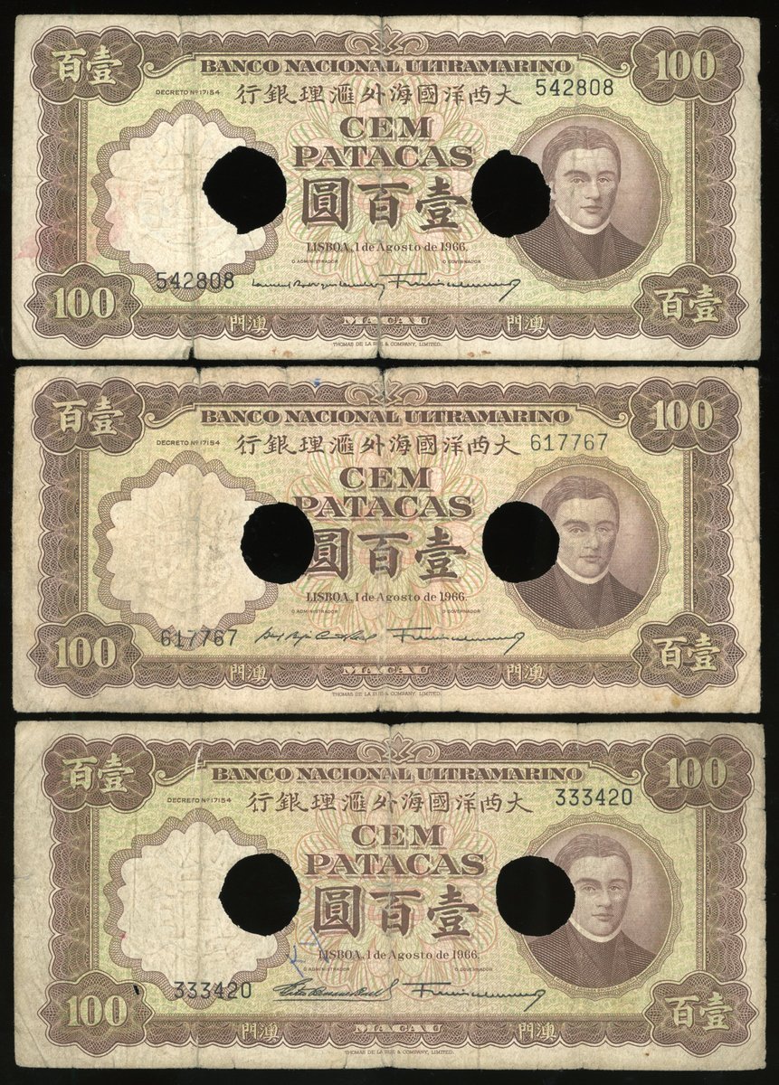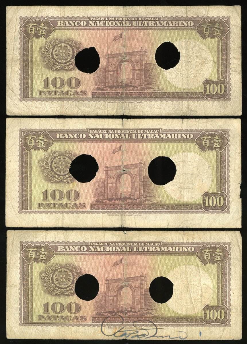 Banco Nacional Ultramarino, Macau, cancelled 100 patacas (10), 1.8.1966, (Pick 51), generally fine, some with tape (10)