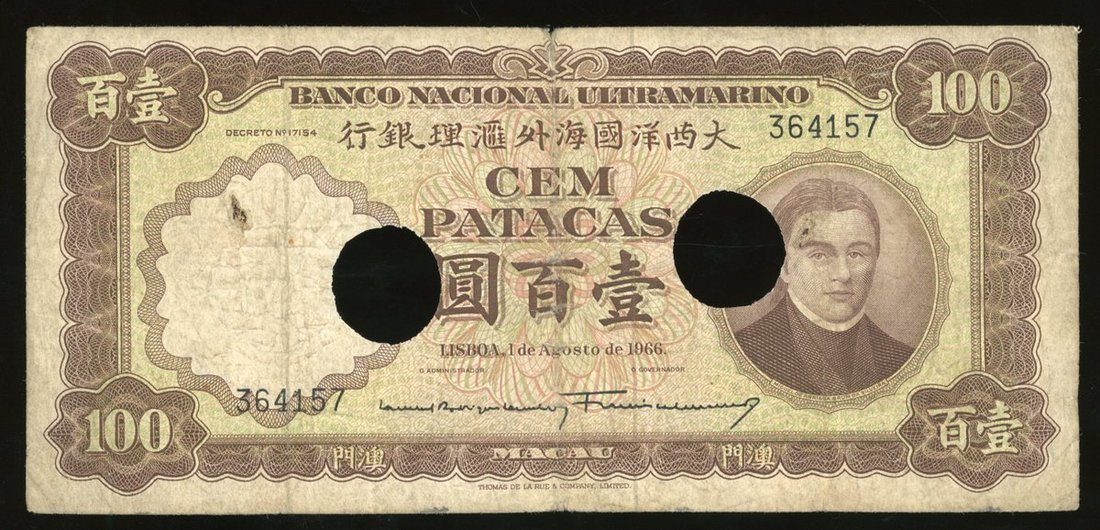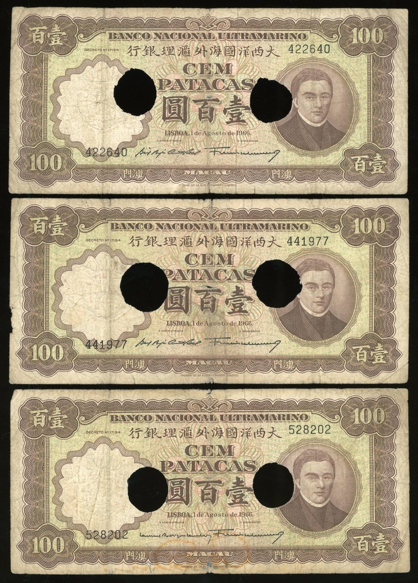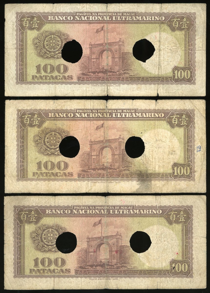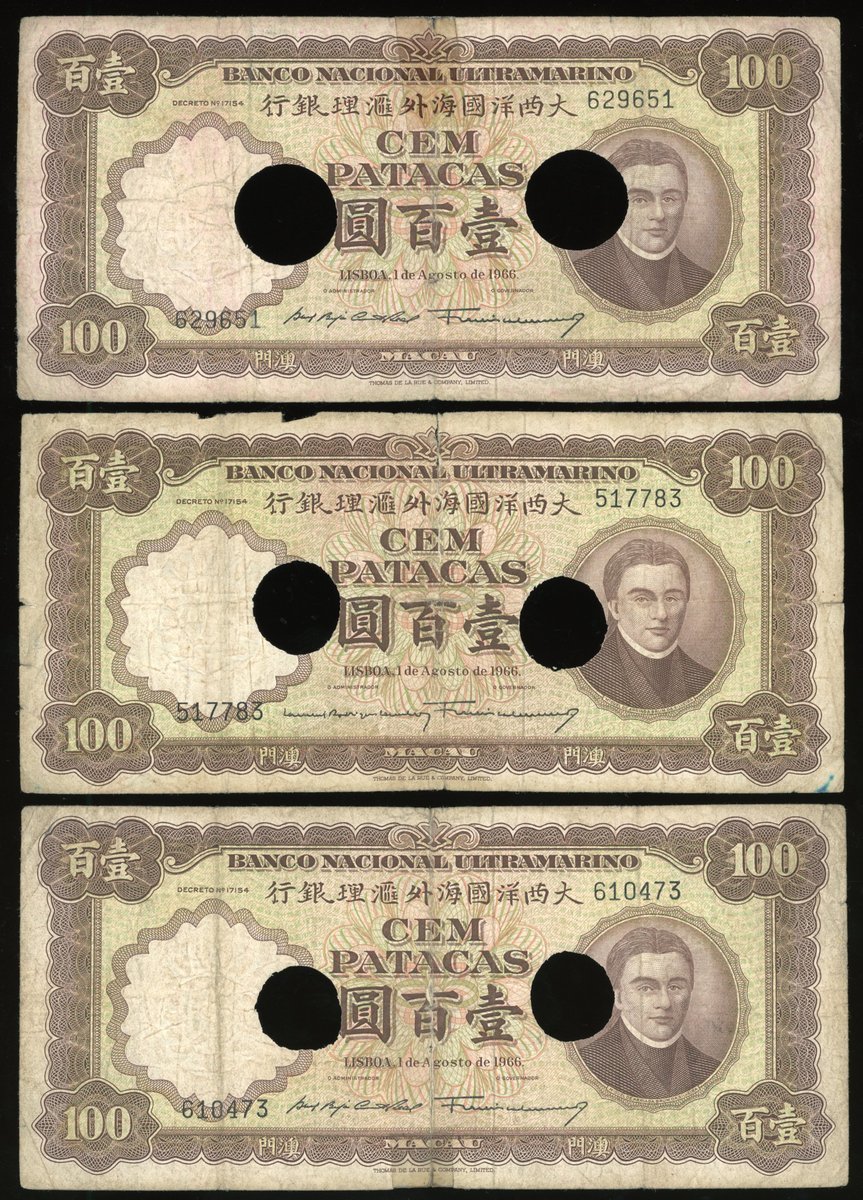 Banco Nacional Ultramarino, Macau, cancelled 100 patacas (10), 1.8.1966, (Pick 51), generally fine, some with tape (10)