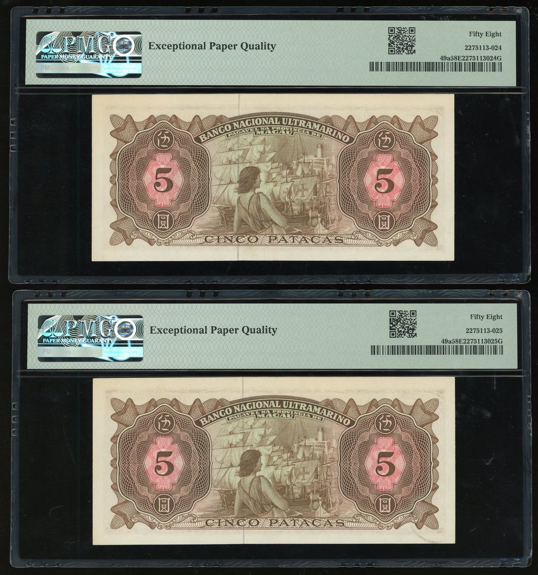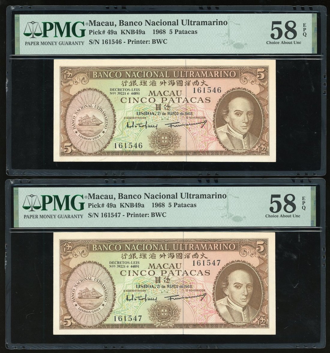 Banco Nacional Ultramarino, Macau, consecutive pair 5 patacas, 21.3.1968, serial number 161546/47, (Pick 49a), both PMG 58EPQ (2)