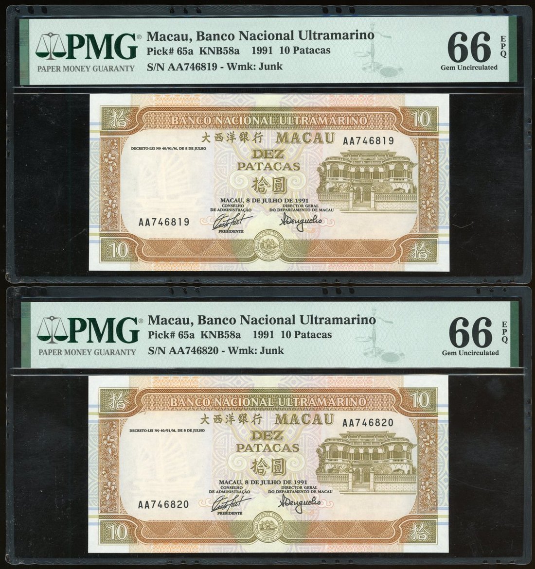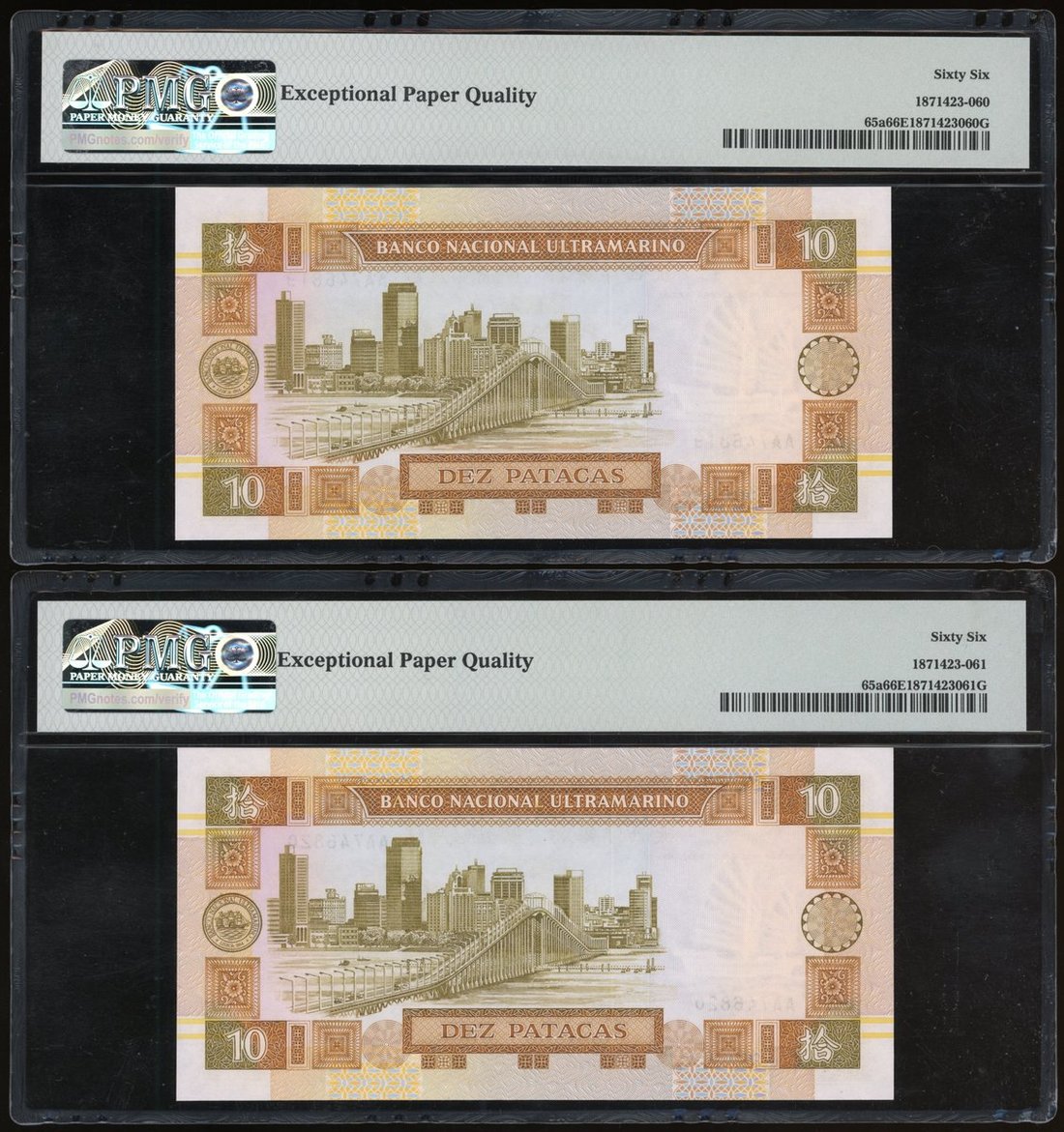 Banco Naciconal Ultramarino, Macau, consecutive pair 10 patacas, 1991, serial numbers AA746819/20, (Pick 65a), PMG 66EPQ (2)