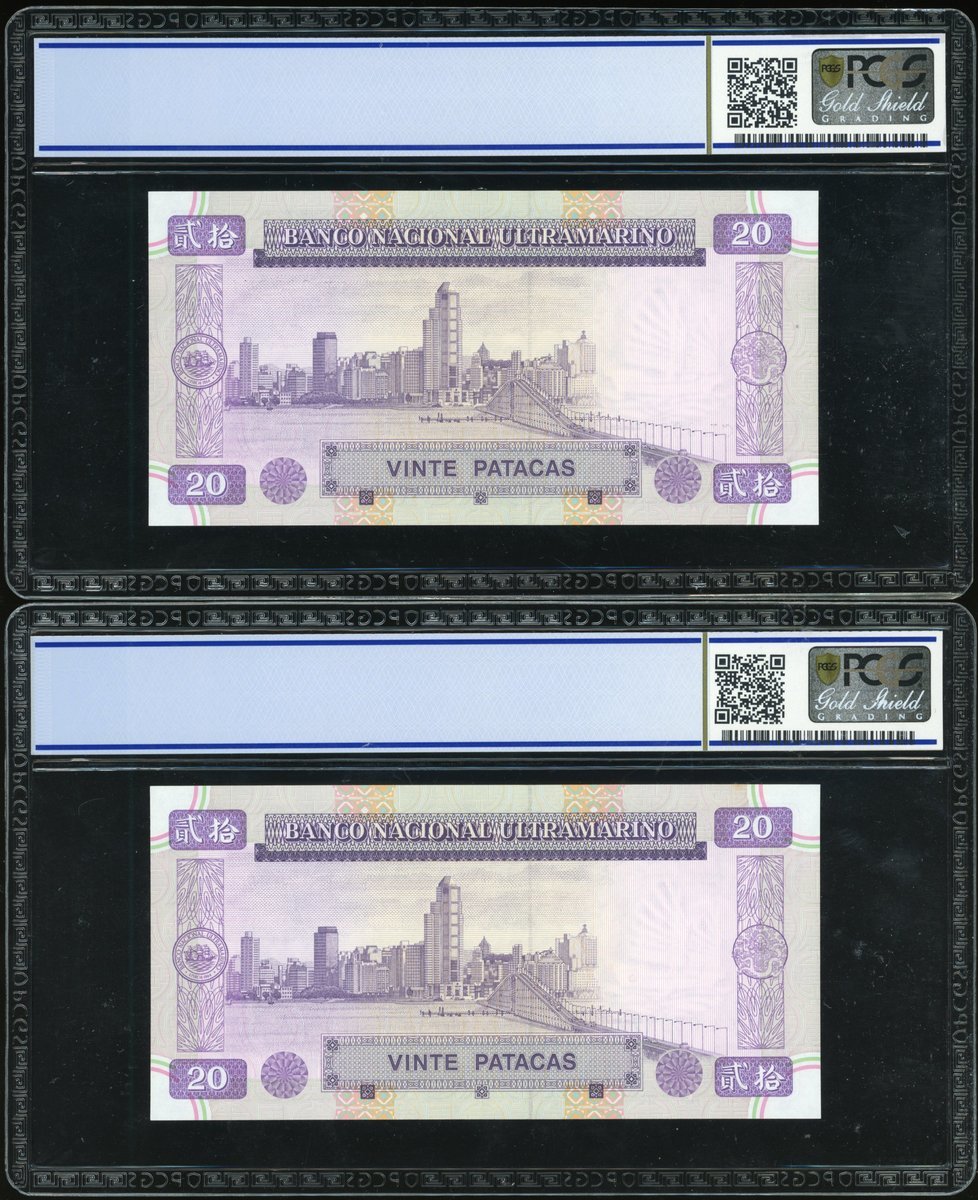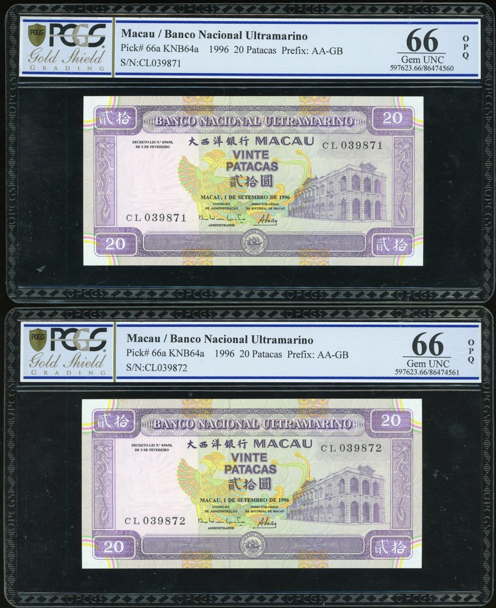 Banco Nacional Ultarmarino, Macau, consecutive pair 20 patacas, 1996, serial number CL039871/72, (Pick 66a), both PCGS 66OPQ gem UNC (2)