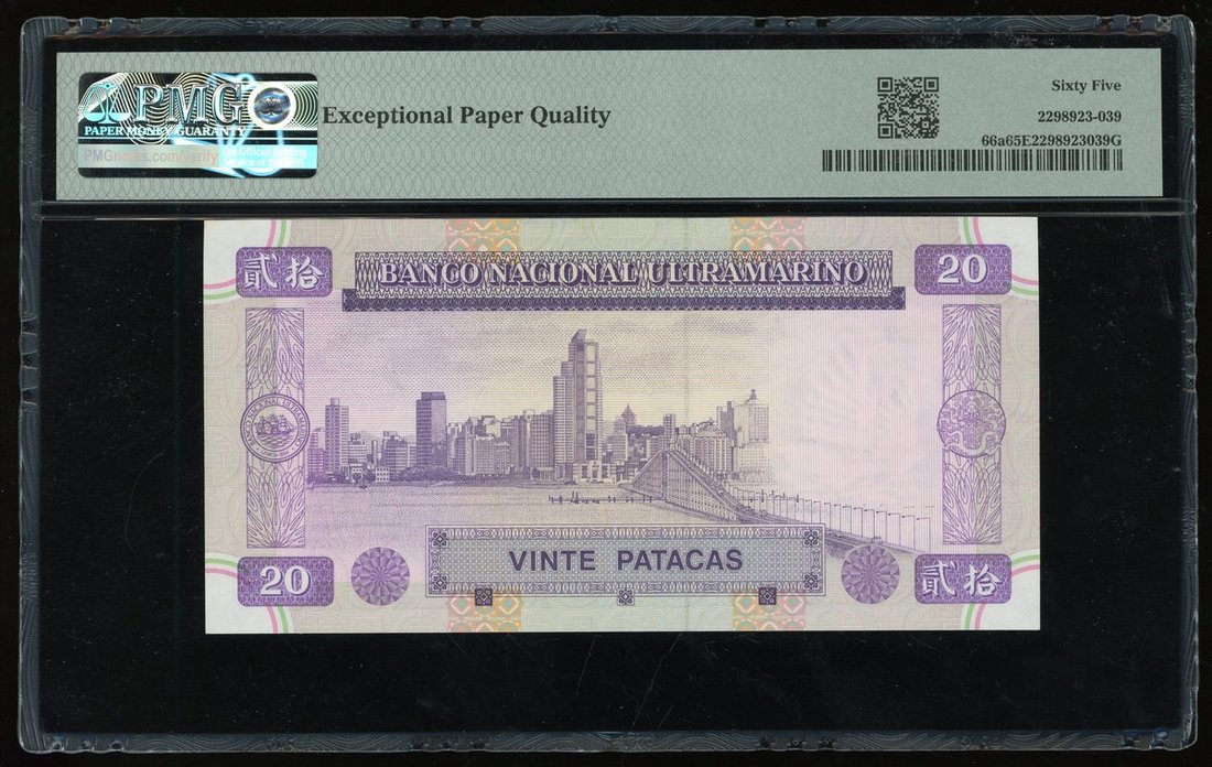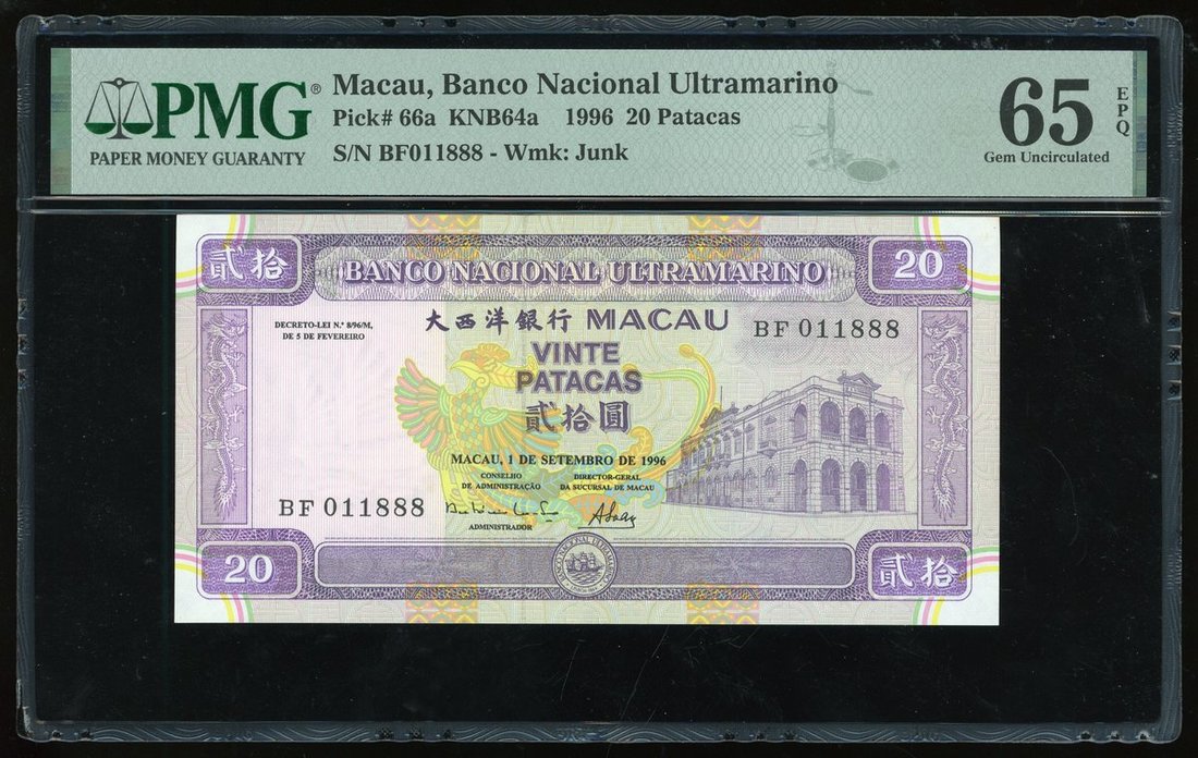 Banco Nacional Ultramarino, Macau, 20 patacas, 1996, serial number BF 011888, (Pick 66a), PMG 65EPQ Gem Uncirculated