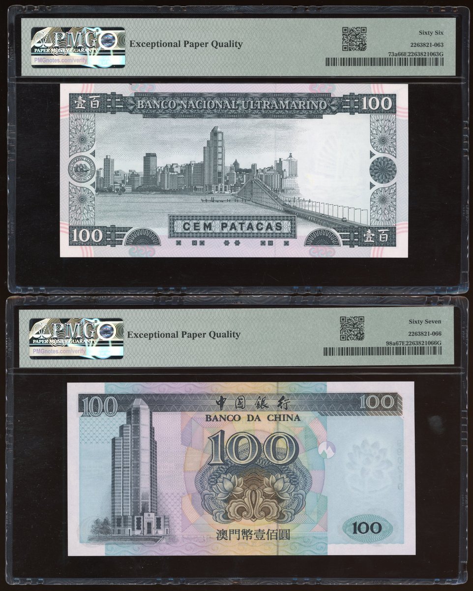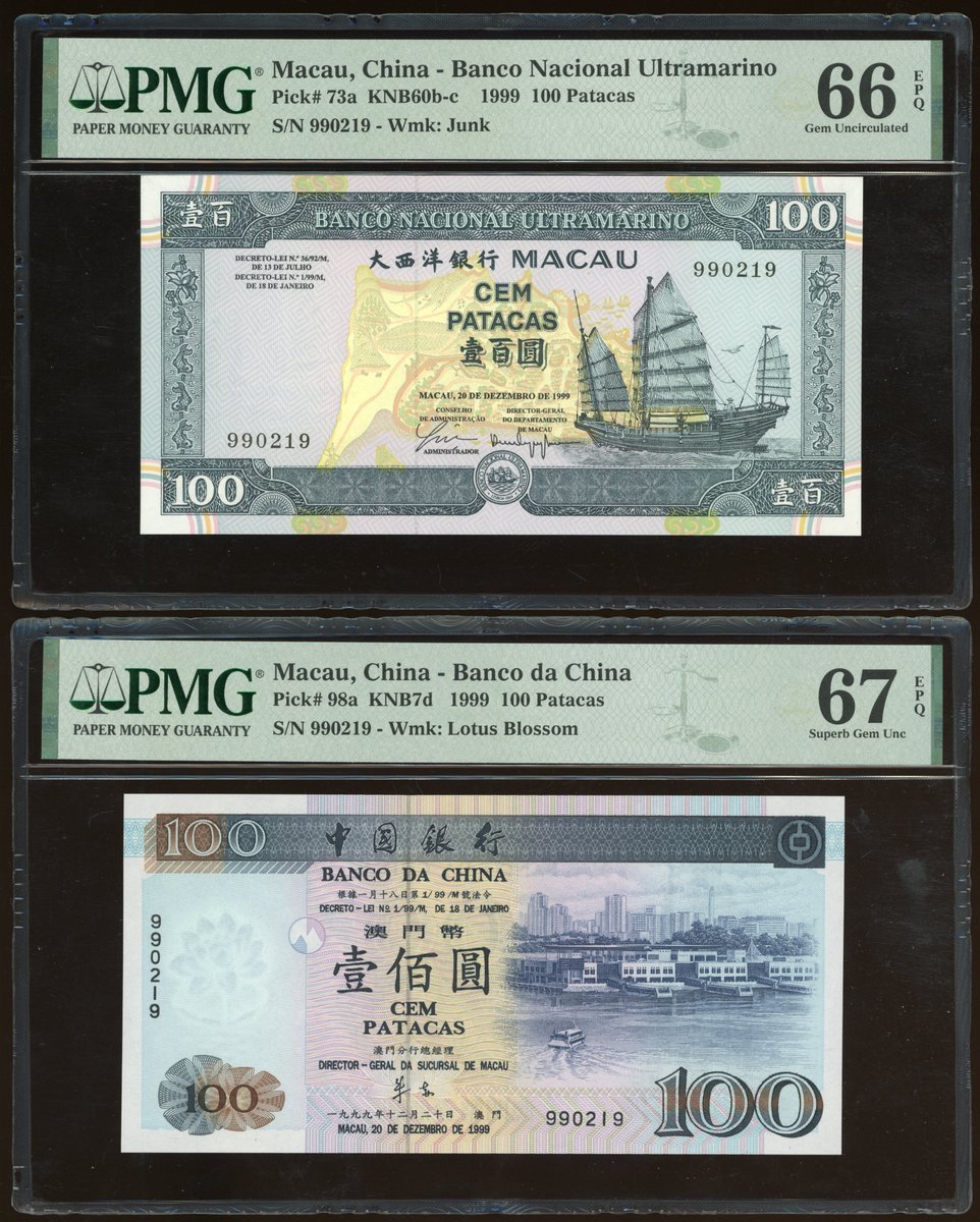 Macau, BNU / BoC, a pair 20 patacas with matching serial number 990219, 1999, (Pick 73a, 98a), PMG 66EPQ and 67EPQ respectively (2)
