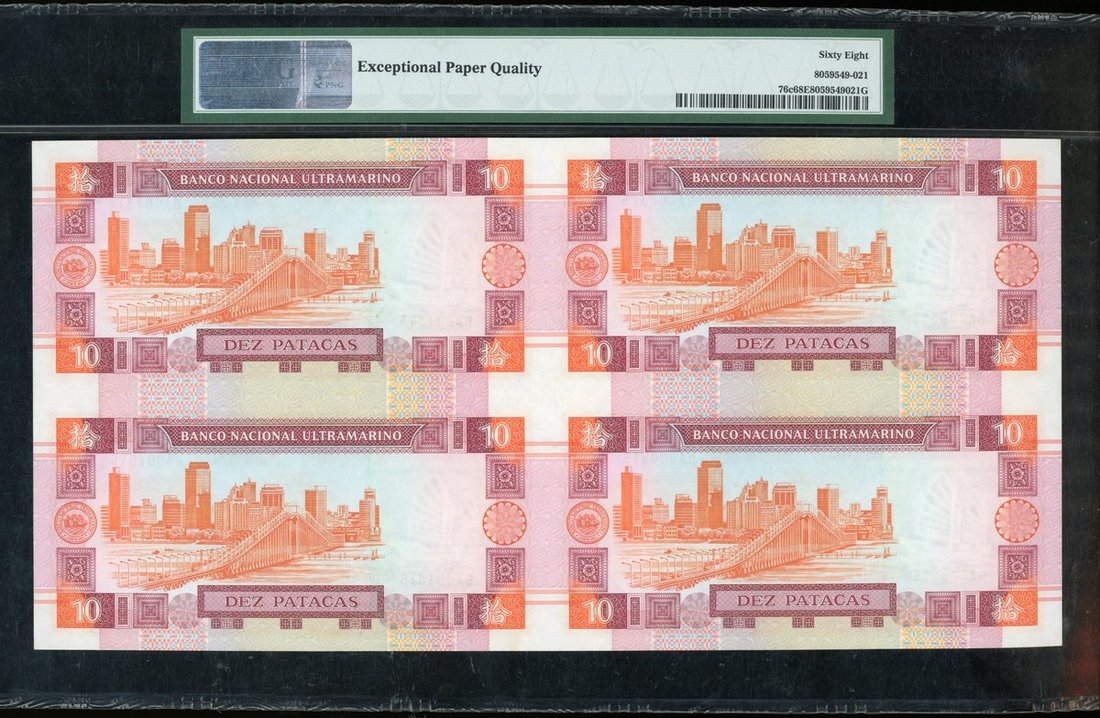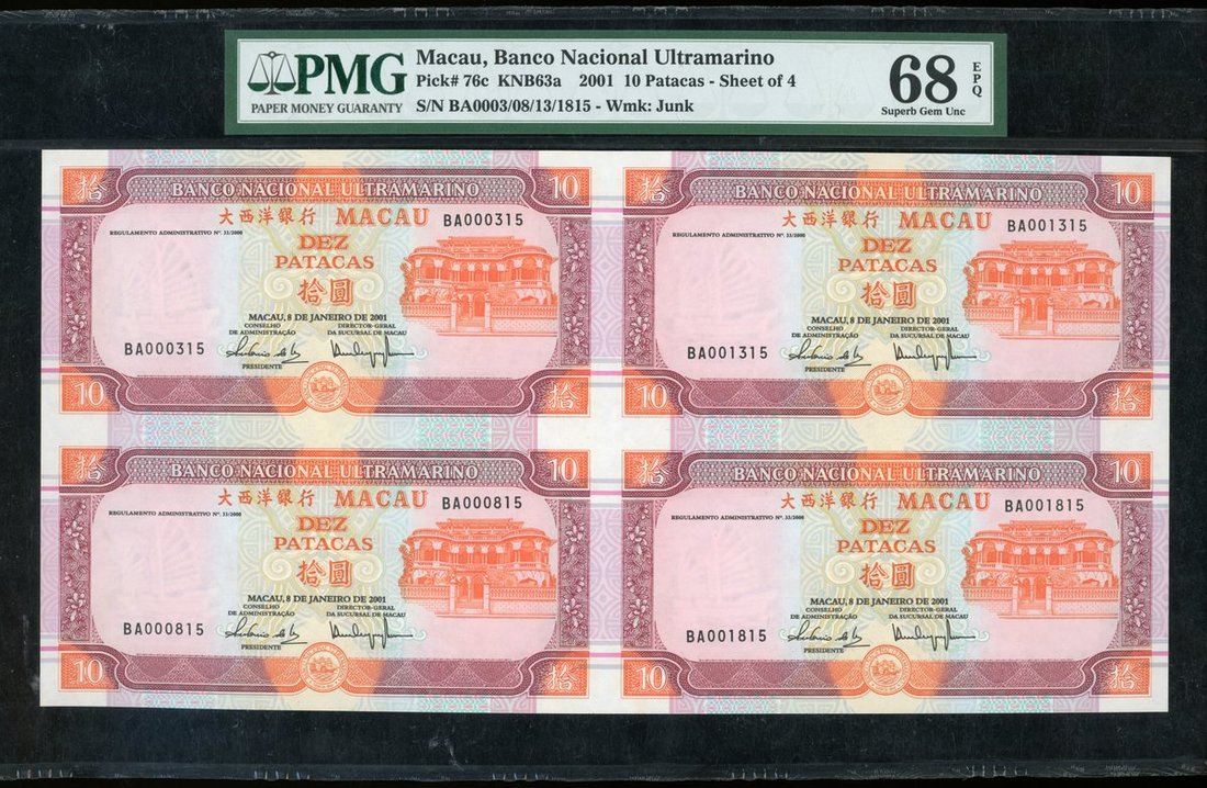 Banco Nacional Ultramarino, Macau, an uncut sheet of 4x 10 patacas, 2003, serial number BA000315/000815/001315/001815, (Pick 76c), PMG 68EPQ Superb Gem Uncirculated