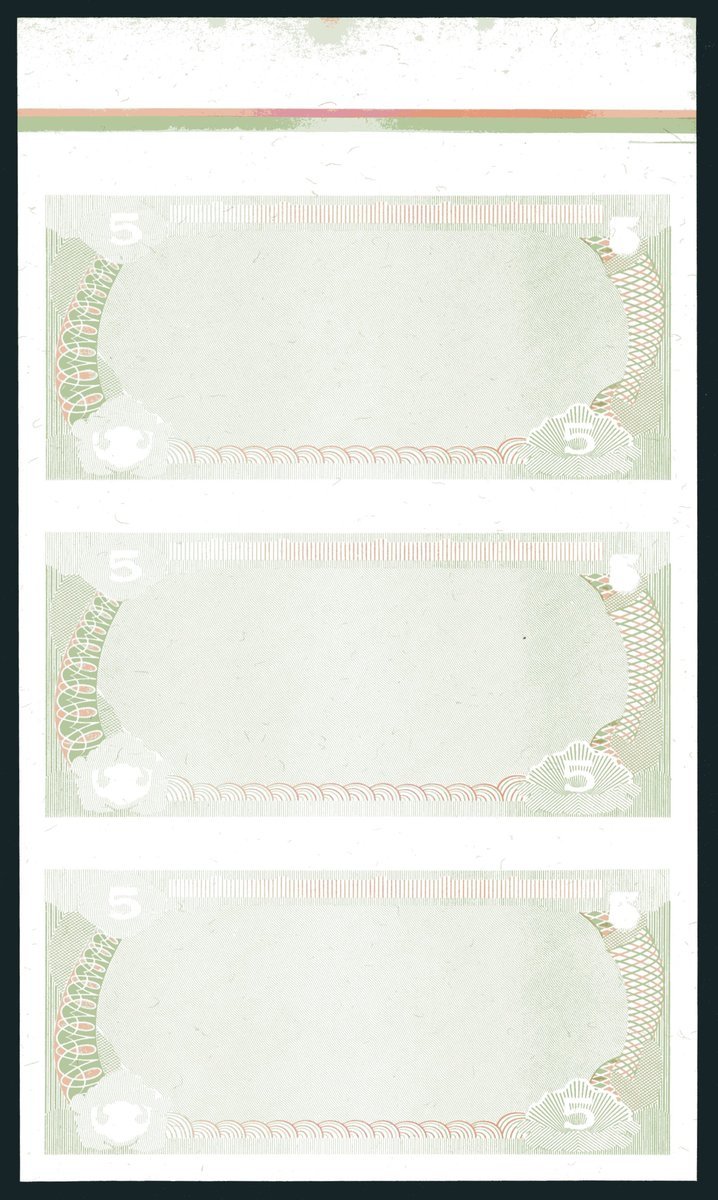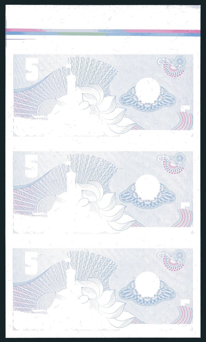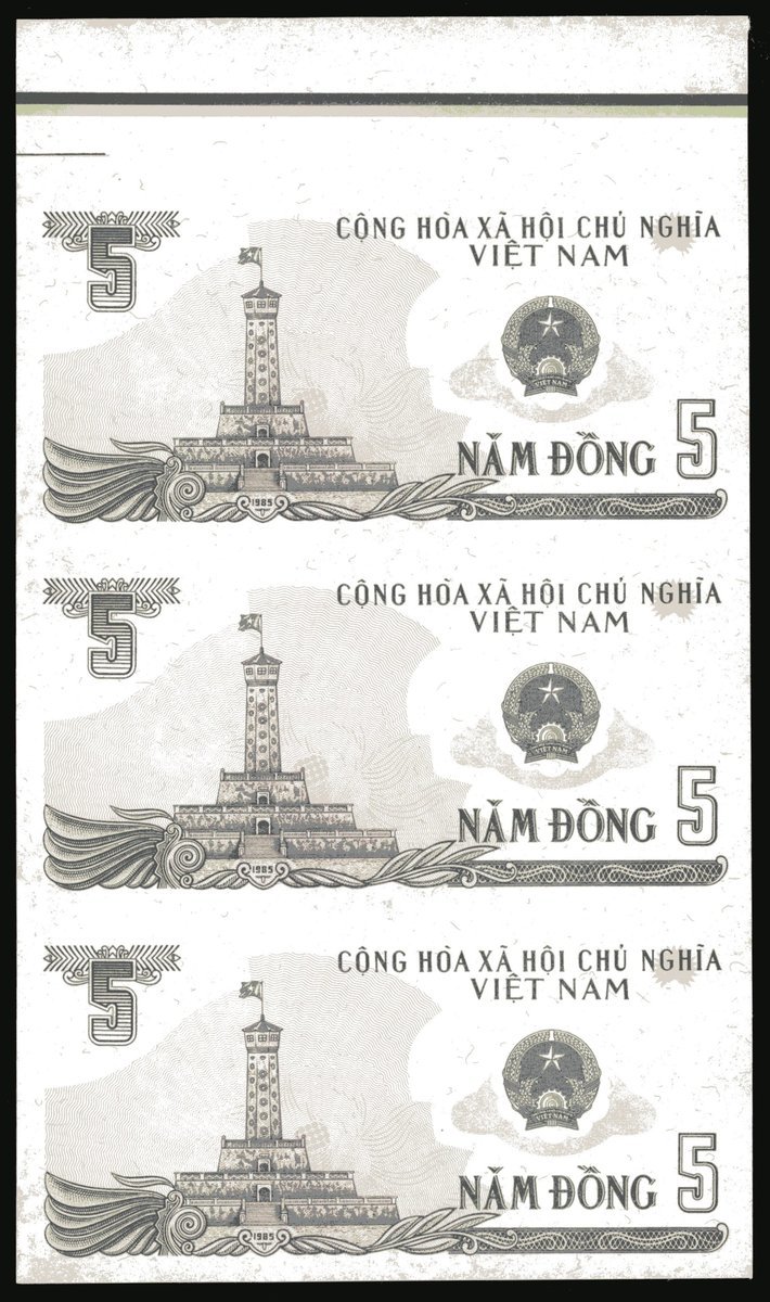State Bank of Vietnam, a group of uncut sheets of three progressive proofs for 5 dong, 1985, all on watermark paper with printing guides at top margin,