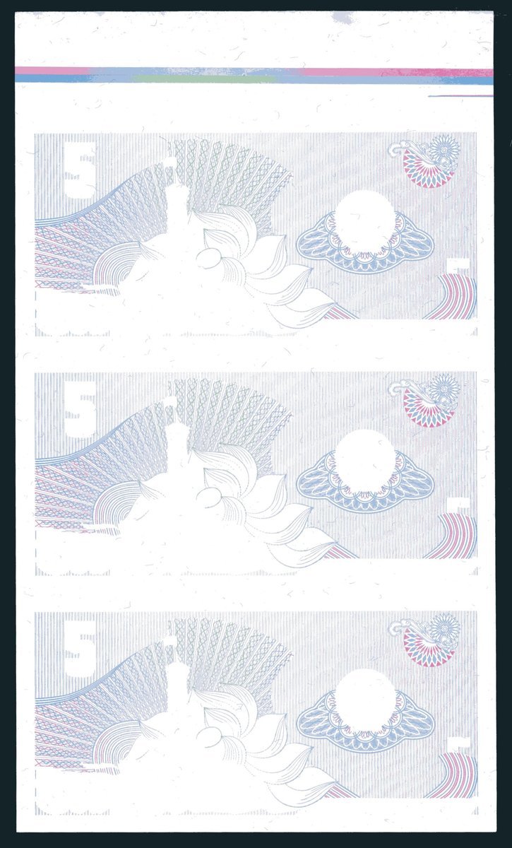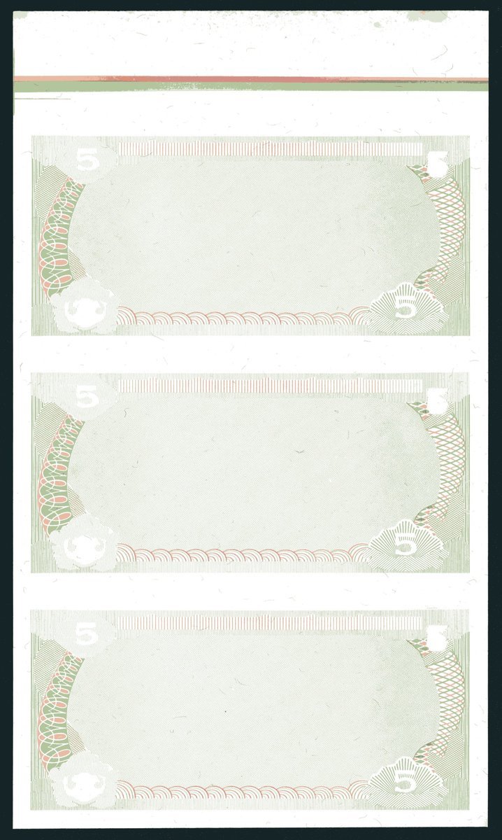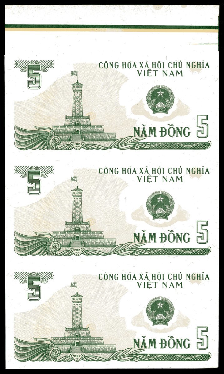 State Bank of Vietnam, a group of uncut sheets of three progressive proofs for 5 dong, 1985, all on watermark paper with printing guides at top margin,
