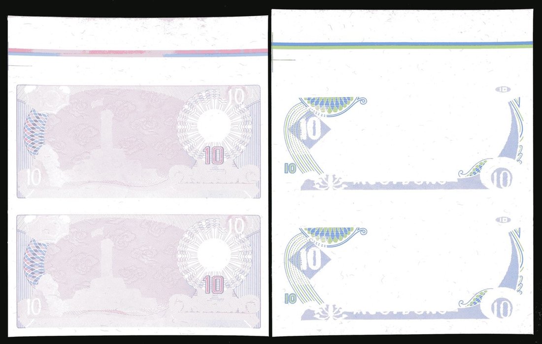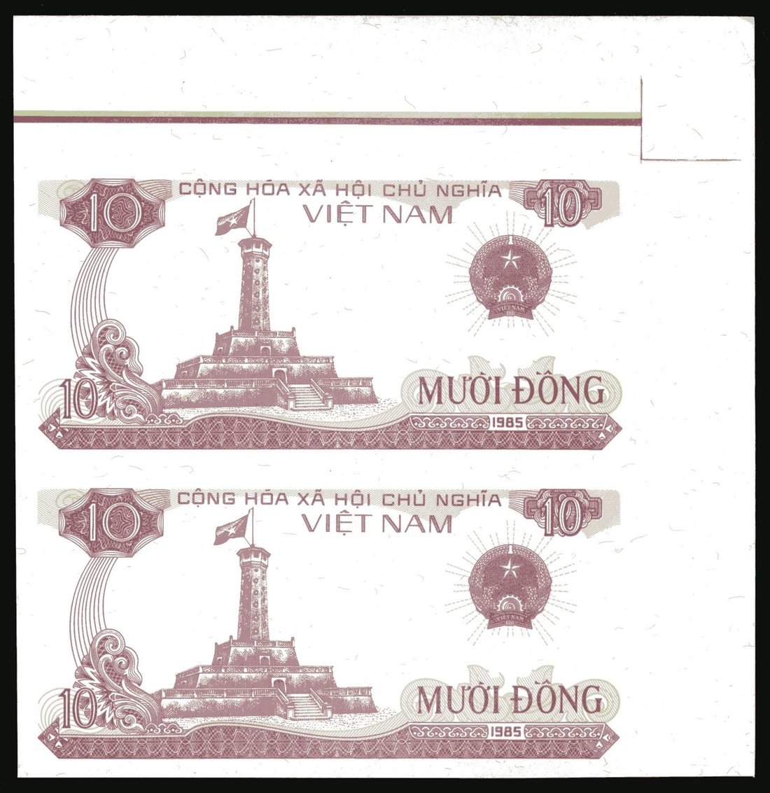State Bank of Vietnam, a group of uncut sheets of two progressive proofs 10 dong (3), 1985, all uniface on watermark paper,