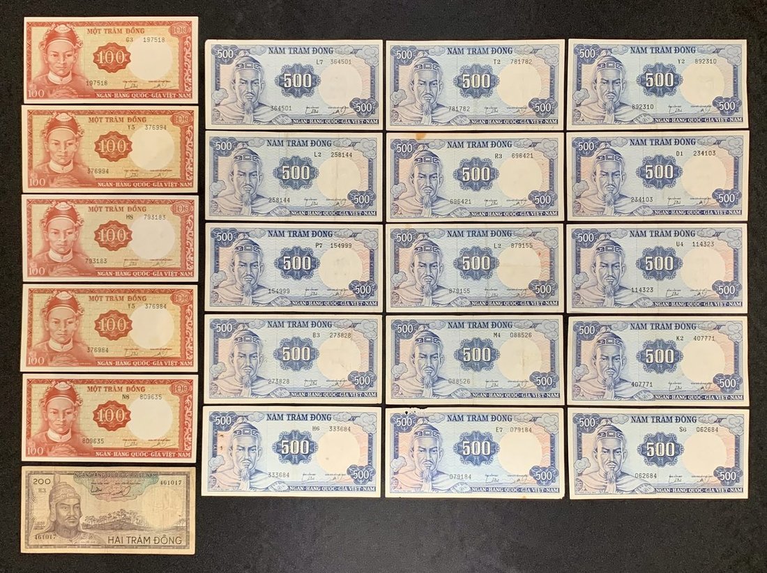 Ngân-Hàng Quoc-Gia Viet-Nam, South Vietnam, a group of 21, including: 5x 100 dong, 1x 200 dong and 15x 500 dong, ND (1966),