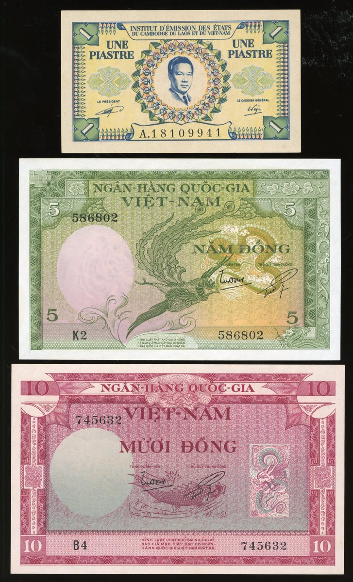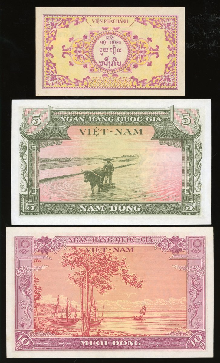 Vietnam, a group of 3, including: Ngân-Hàng Quoc-Gia Viet-Nam 5 dong and 10 dong, ND (1955); Institut d'Émission des États du Cambodge, du Laos et du Vietnam 1 piastre, ND (1953); serial numbers K2 586802, B4 745632 and A.18109941,
