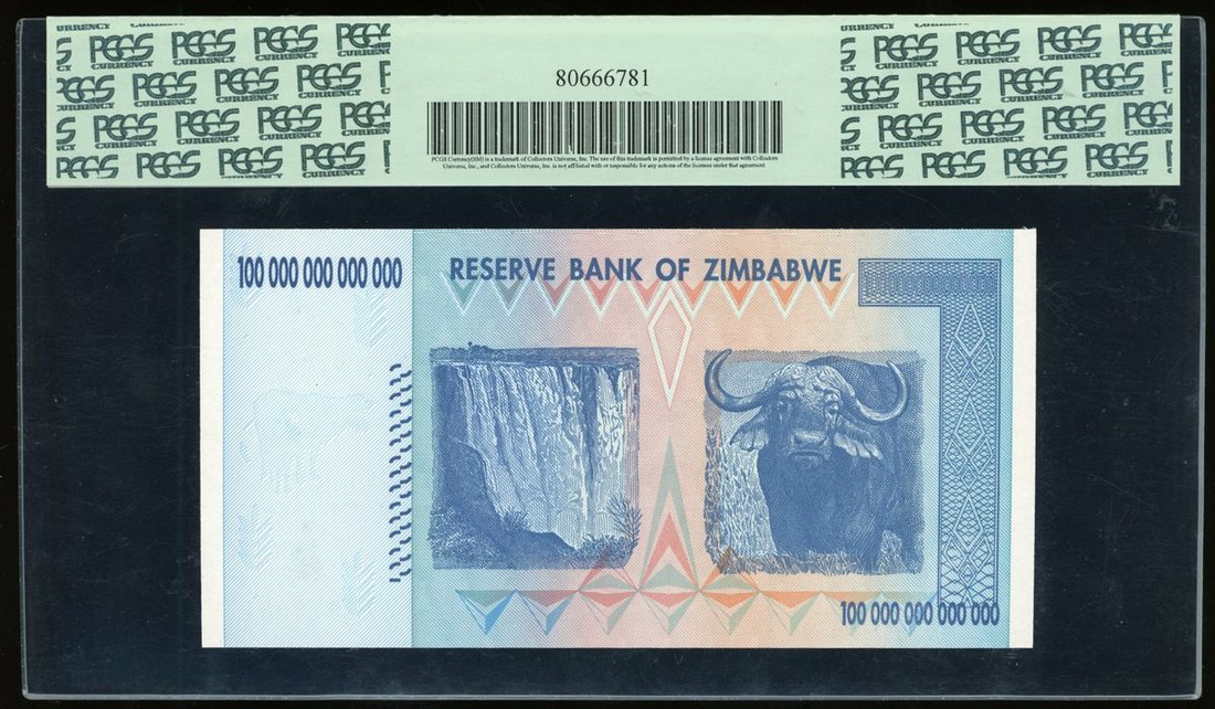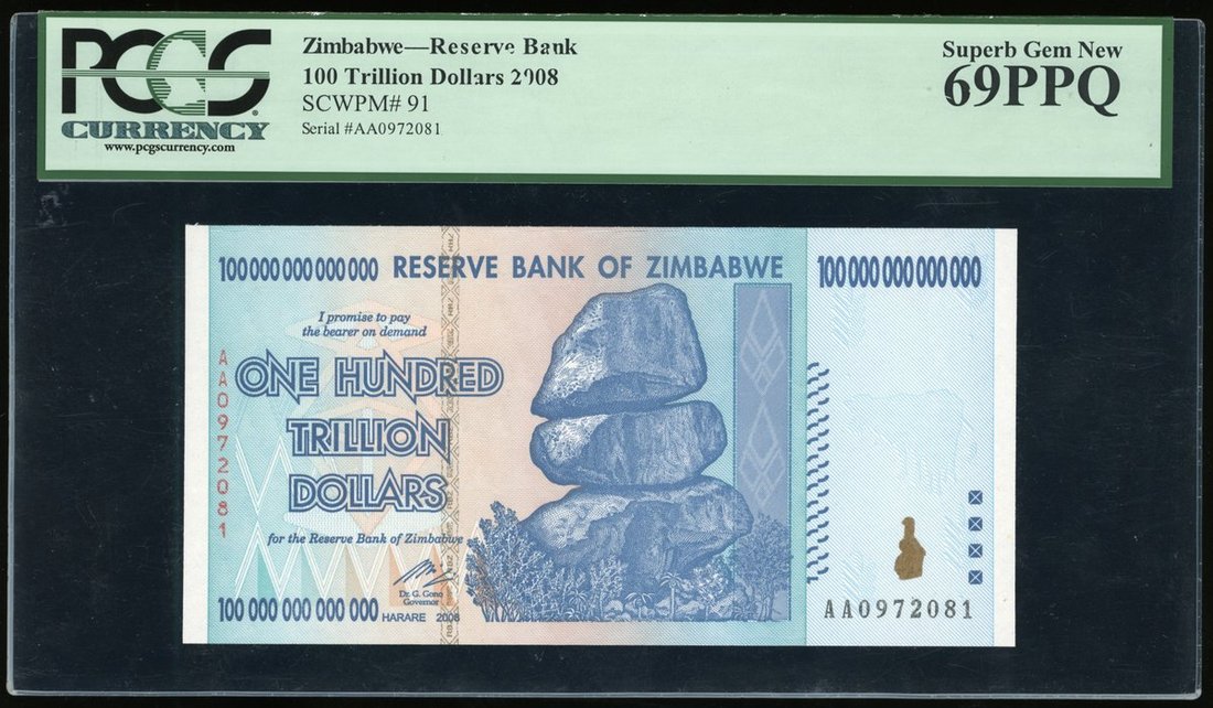 Reserve Bank of Zimbabwe, 100 trillion dollars, 2008, serial number AA0972081, (Pick 91), PCGS 69PPQ. An always popular hyperinflation note