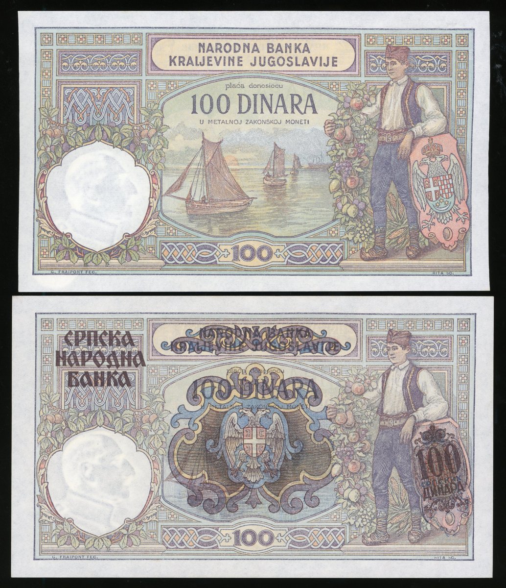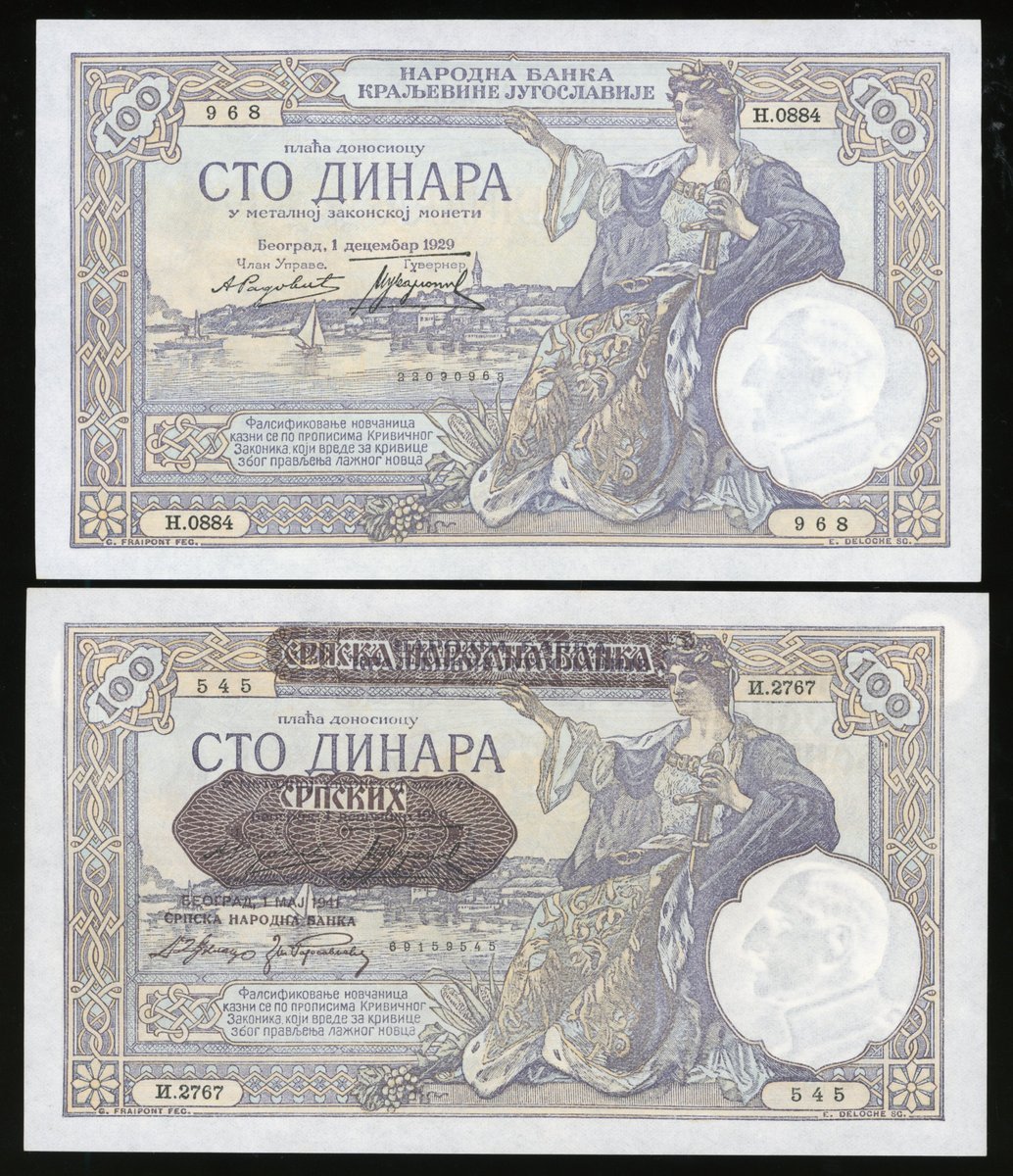 Yugoslavia and Serbia, a pair of 100 dinaras, 1929 and 1941, the Serbian 100 Srpskih Dinara is on overprint on the Yugoslavian 100 dinara,