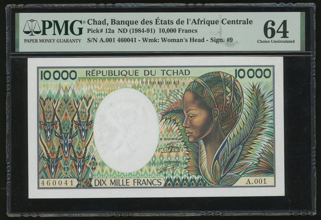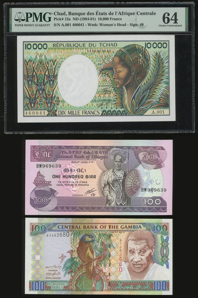 African Banknotes Mixed Lot, group of 3 notes, Chad: 10,000 francs, 1984-1991, first prefix A.001,