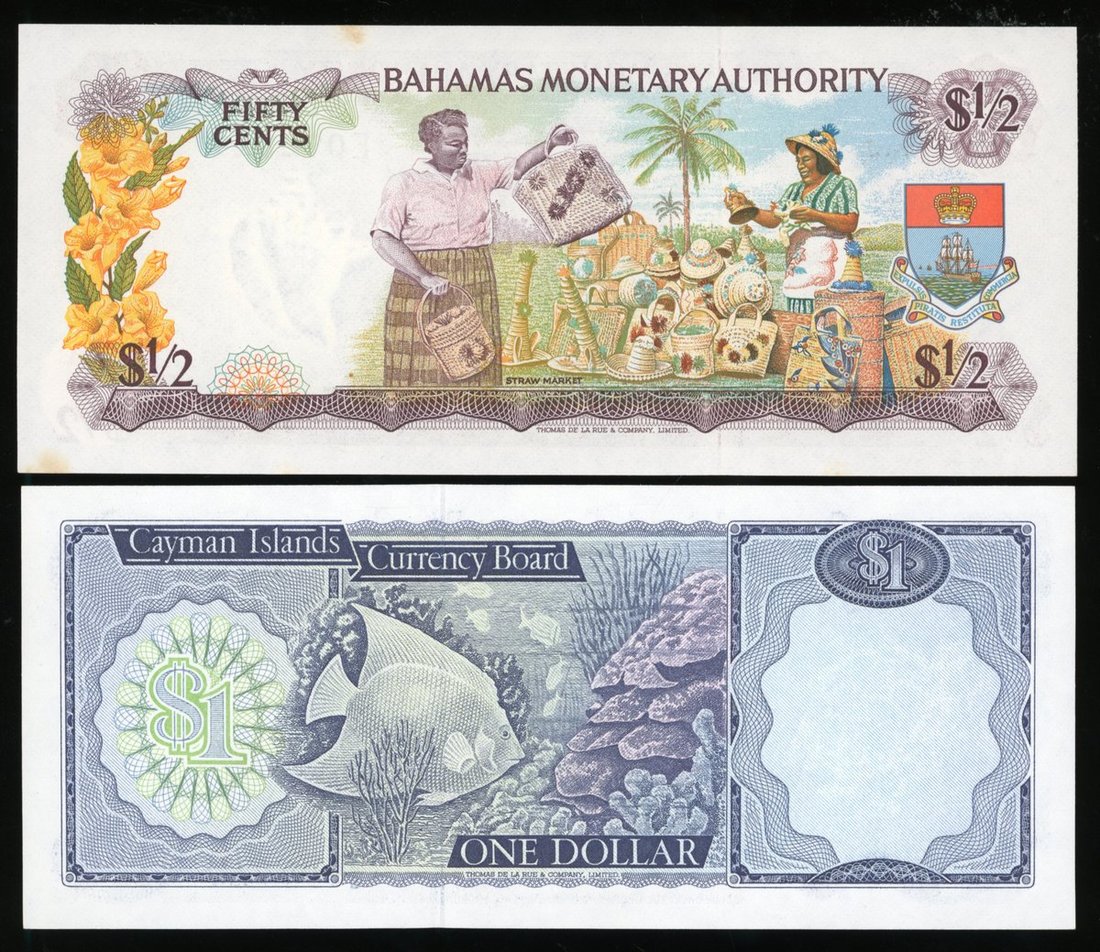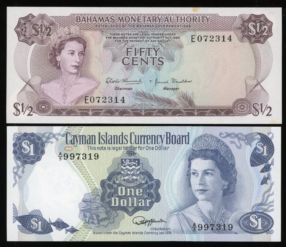 Caribbean, Bahamas 50 cents, 1968; Cayman Islands $1, 1974; serial numbers E 072314 and A/5 997319,