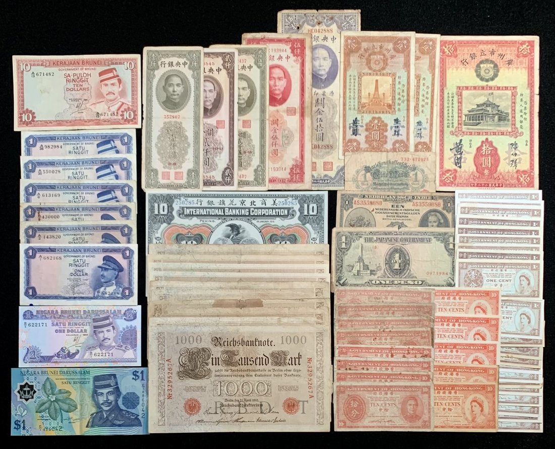 World Banknotes, a group of 63x, including, Brunei (9), China (8), Germany (9), Hong Kong (35), Japanese Occupation - The Philippines (1), Netherlands Indies (1),