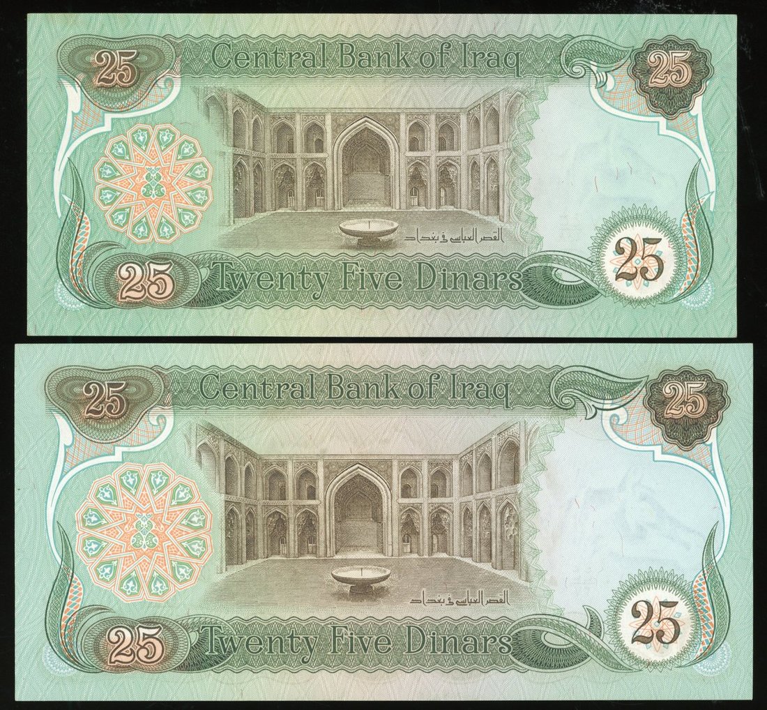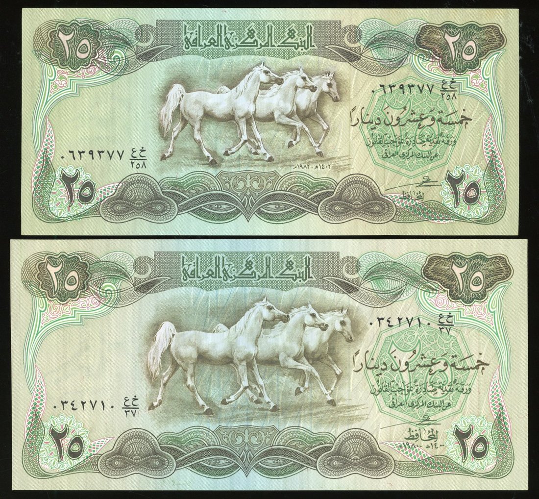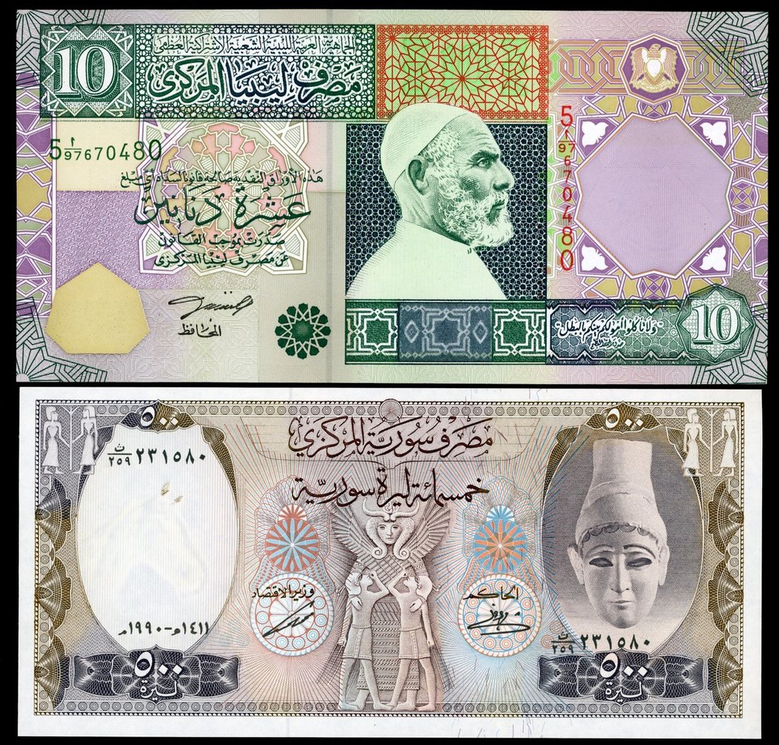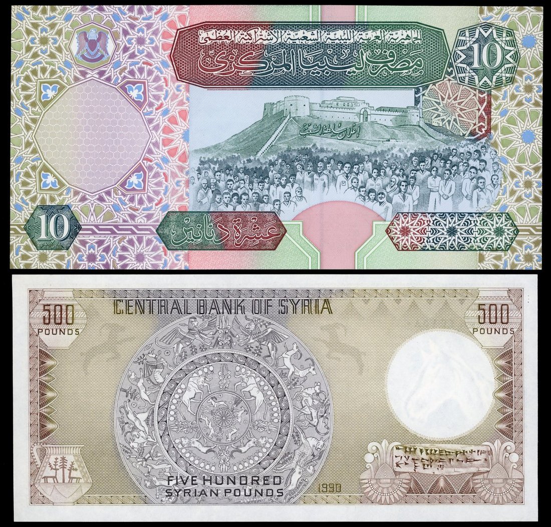 World Banknotes, a group of 4, including: Libya 10 dinars, ND (2002); Syria 500 pounds, 1990; 2x Iraq 25 dinars, 1980 and 1982;