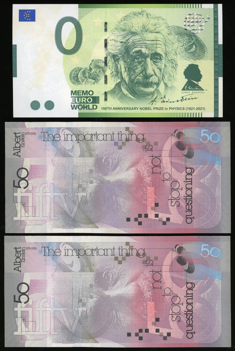 De La Rue Test Notes, a pair of test notes, 50 units, Albert Einstein, slightly different security threads, solid serial numbers 5555555 and 7777777, also a 0 euro fantasy note, 100th Anniversary of Einstein's Nobel Prize in Physics commemorative issue,