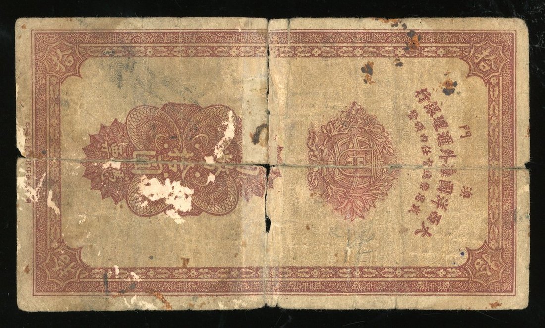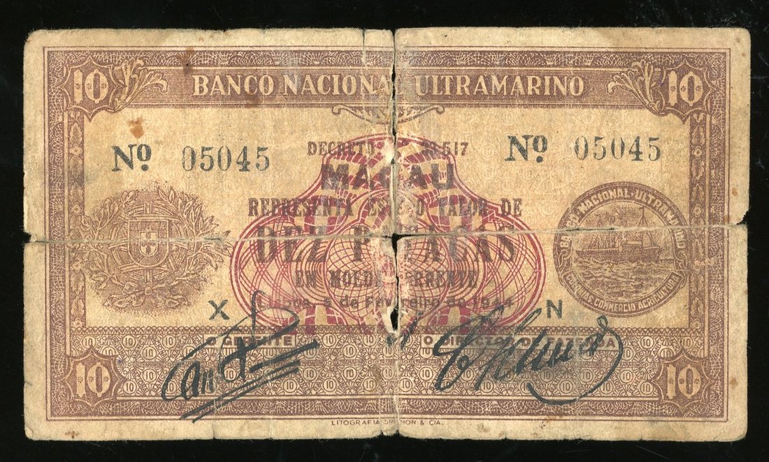 Banco Nacional Ultramarino, Macau, 10 patacas, 1944, serial number 05045, (Pick 23), fair. Sold as is, no return. Viewing highly recommended
