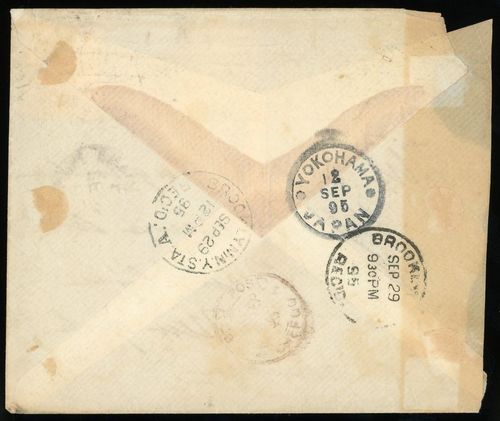 1895 (2 Sep.) envelope to New York bearing Chefoo L.P. 1c. red tied by the triple-ring c.d.s., in combination with Japan Koban 5s. tied by "Shanghai I.J.P.O." c.d.s., on reverse showing Yokohama (12.9) and Brooklyn (29.9) arrival c.d.s., fine.