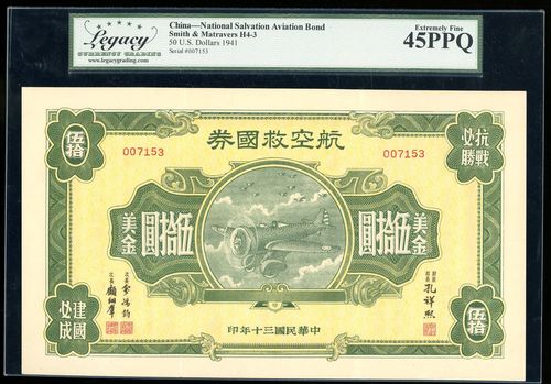 National Salvation Aviation Bond, China, US$50, 1941, serial number 007153, green on yellow, aircraft at centre,