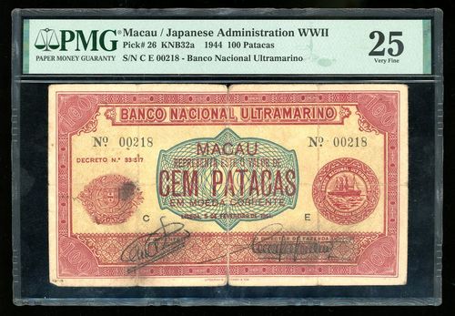 Banco Nacional Ultramarino, Macau, Japanese Occupation, 100 patacas, 5.2.1944, serial number 00218, (Pick 26), PMG 25 very fine, rust, splits. Only 67,000 were issued making it second scarcest type after the 500 patacas. Rare in any grade