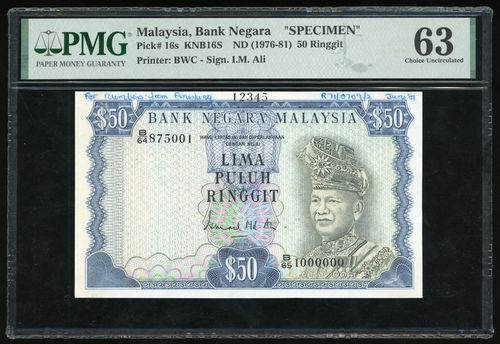 1976-81年馬來西亞10令吉檔案樣票,編號 B/64 875001 - 1000000,PMG 63,有印刷者註釋及黏貼痕跡。此樣票格式的編號範圍乃印刷商Bradbury Wilkinson獨有,曾用於鈔票生產過程中,遠較有加蓋「SPECIMEN」的樣票珍稀